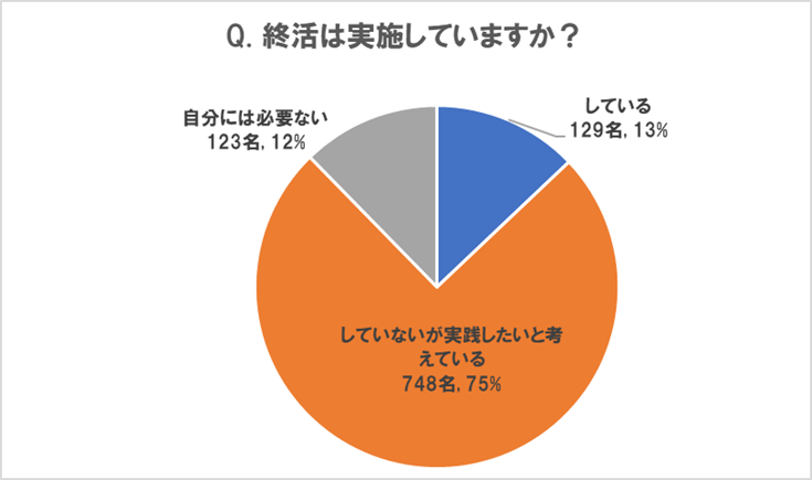 おひとりさまで実際に終活を「実践している」人は13%と少数 「していないが実践したいと考えている」人は75%と多い |