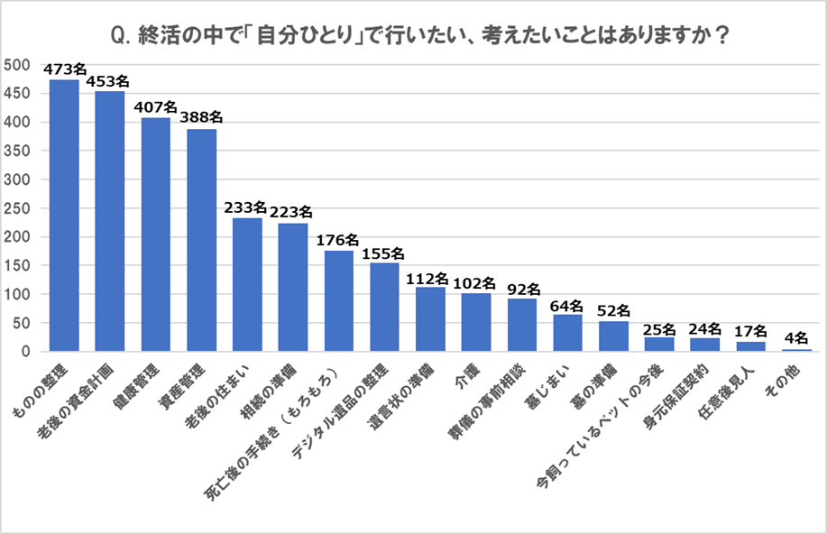 ■ひとりで行いたい・考えたい「終活」の上位は「ものの整理」「老後の資金計画」「健康管理」