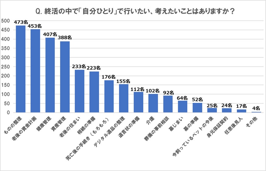 自分ひとりで行いたい・考えたい終活の上位は、 「ものの整理」47%、「老後の資金計画」45%、「健康管理」41% 死後の準備よりも、老後のより良い生活に向けての準備を望む傾向 |