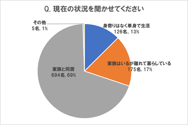 「身寄りはなく単身で生活」する人が13%、「家族と同居」が69% 「家族はいるが離れて暮らしている」人と合わせると86%が「家族がいるおひとりさま」 |