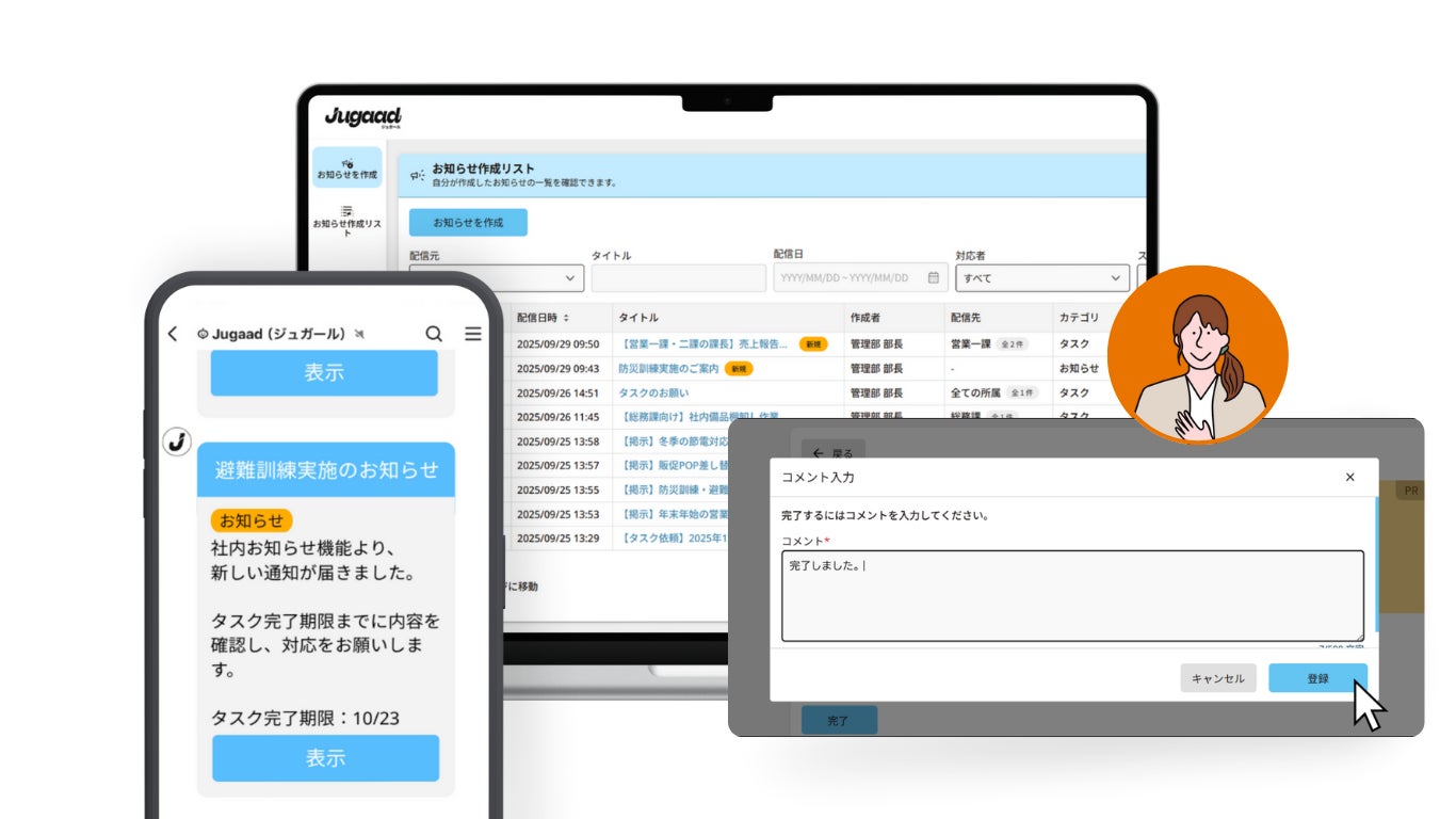 チャットツールだけでは追いきれない「1対全体」の公式な指示を、新機能「お知らせ機能」が確実に届け、完了までを可視化。特に多拠点ビジネスにおいて、本社の意図が全現場の確実なアクションへと変わる、強い実行力を組織にもたらします。 -