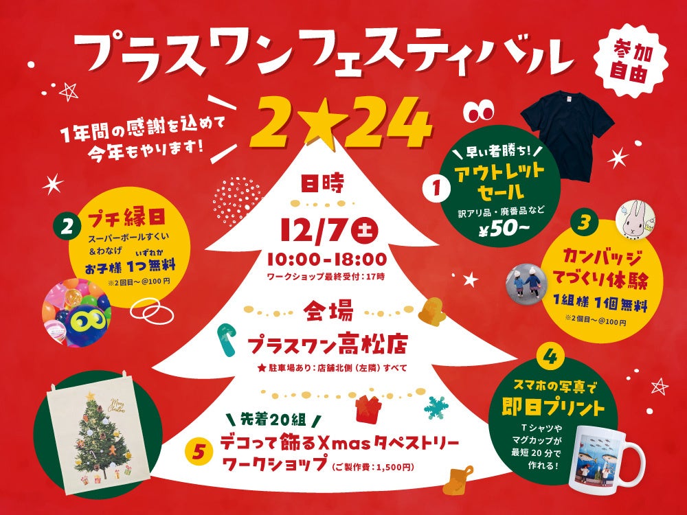 オリジナルウェア・グッズの製造販売を行う株式会社プラスワンインターナショナル(本社:香川県高松市、代表取締役:新開強、以下プラスワン)は、モノづくりを通してワクワクする体験ができるイベント「プラスワンフェスティバル2024」を2024年12月7日(土)にプラスワン高松店にて開催いたします。