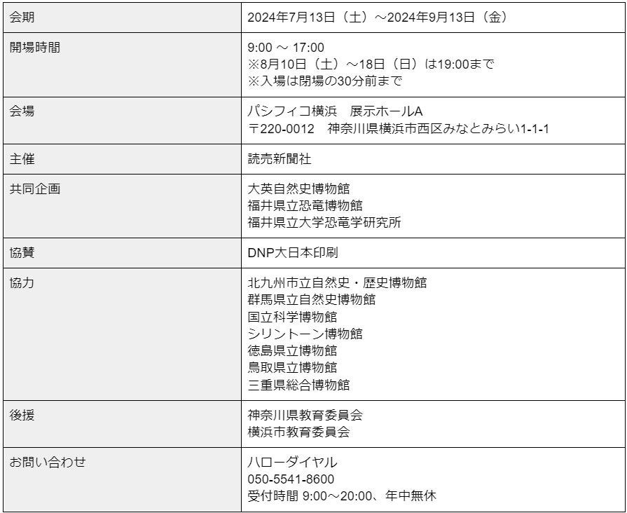 さらに、福井県立恐竜博物館、福井県立大学恐竜学研究所の監修のもと、竜脚類以外の恐竜や、恐竜以外の古代〜現代の様々な生物の標本も各地から集結!生物巨大化の秘密を解き明かし、恐竜の進化と繁栄の歴史をたどる、この夏必見の展覧会です!