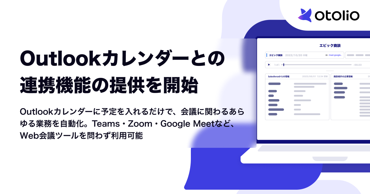 エピックベース株式会社(本社:東京都品川区、代表取締役:松田崇義)は、議事録作成などの会議に関わるあらゆる業務を自動で実行するAIエージェントサービス「Otolio」において、Microsoft Outlookカレンダーとの連携機能の提供を開始いたしました。