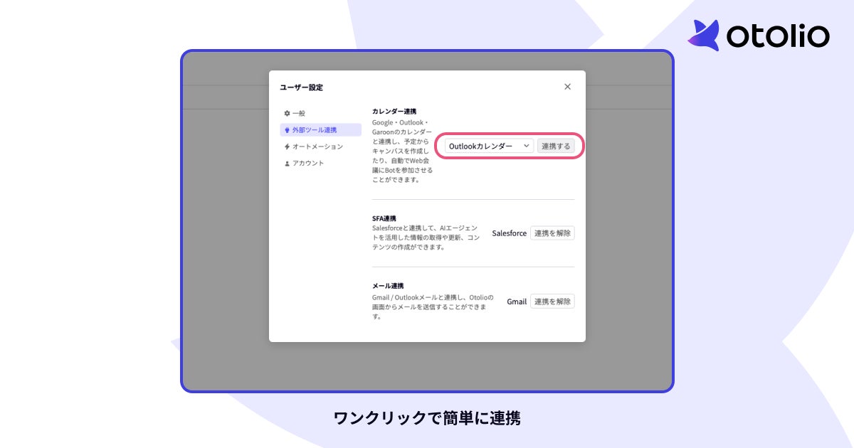 1. 複雑な設定は不要、Otolioの画面上からワンクリックで簡単に連携