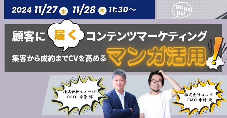 株式会社イノーバ(東京都新宿区、代表取締役社長CEO:宗像 淳、以下「イノーバ」)は、株式会社コルク(東京都渋谷区、代表取締役CEO:佐渡島 庸平)と共同で、BtoB企業に向けたマンガコンテンツ活用セミナー「顧客に"届く"コンテンツマーケティング-集客から成約までCVを高めるマンガ活用‐」を、2024年11月27日(水)11:30より生配信、28日(木)11:30より録画配信にて開催いたします。