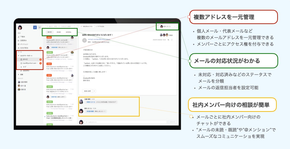 「yaritori」は、対外的な顧客対応を担う営業・CSに特化したクラウド型のメールサービスです。「複数メールの対応状況をチームで一元管理」「Slack・Chatwork連携」などで社内外のコミュニケーションを効率化し、迅速な顧客対応を実現できます。