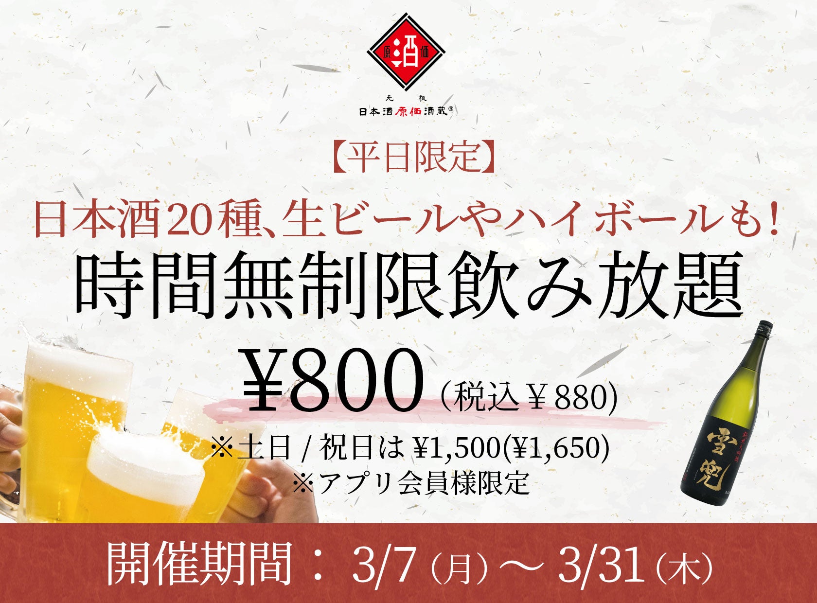 3月7日(月)~3月31日(木)に日本酒原価酒蔵全店にて時間無制限飲み放題¥800(¥880)~を開催します。