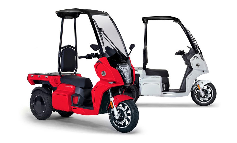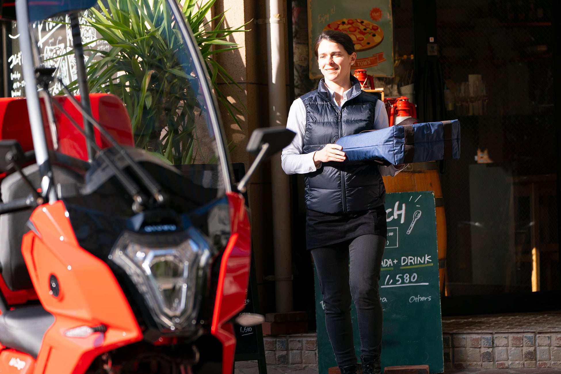 大型スクリーンとルーフ、独立懸架リアサスペンションによる3輪構造、前後13インチ大径ホイールという独自の車体構成により、従来のビジネスバイクが持つさまざまな課題を解決する、原付一種(50ccクラス)の電動3輪バイク。3.85kWhの大容量リチウムイオンバッテリーを搭載し、一回の充電で最大89km(30km/h定地走行値)の走行が可能です。
