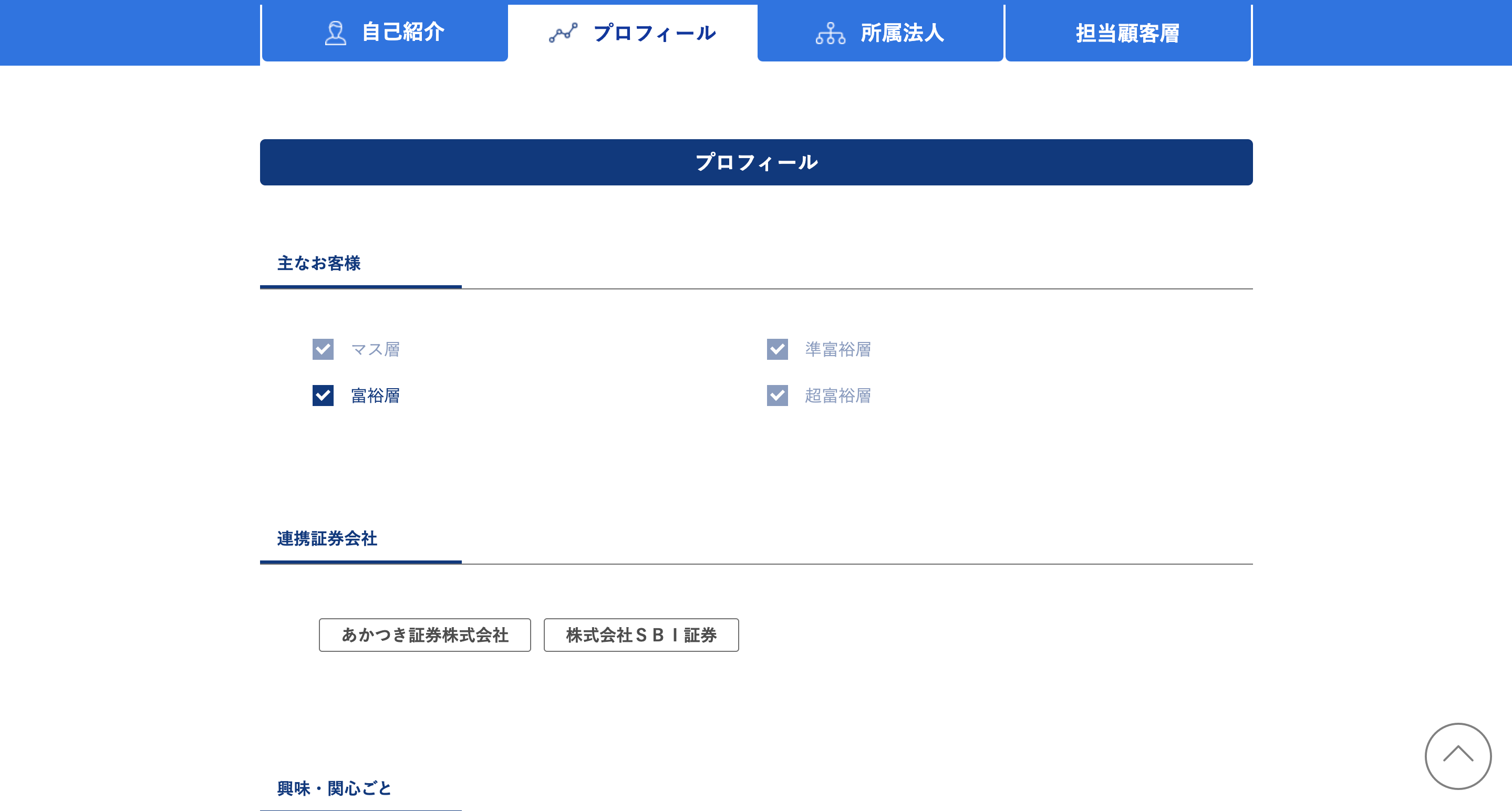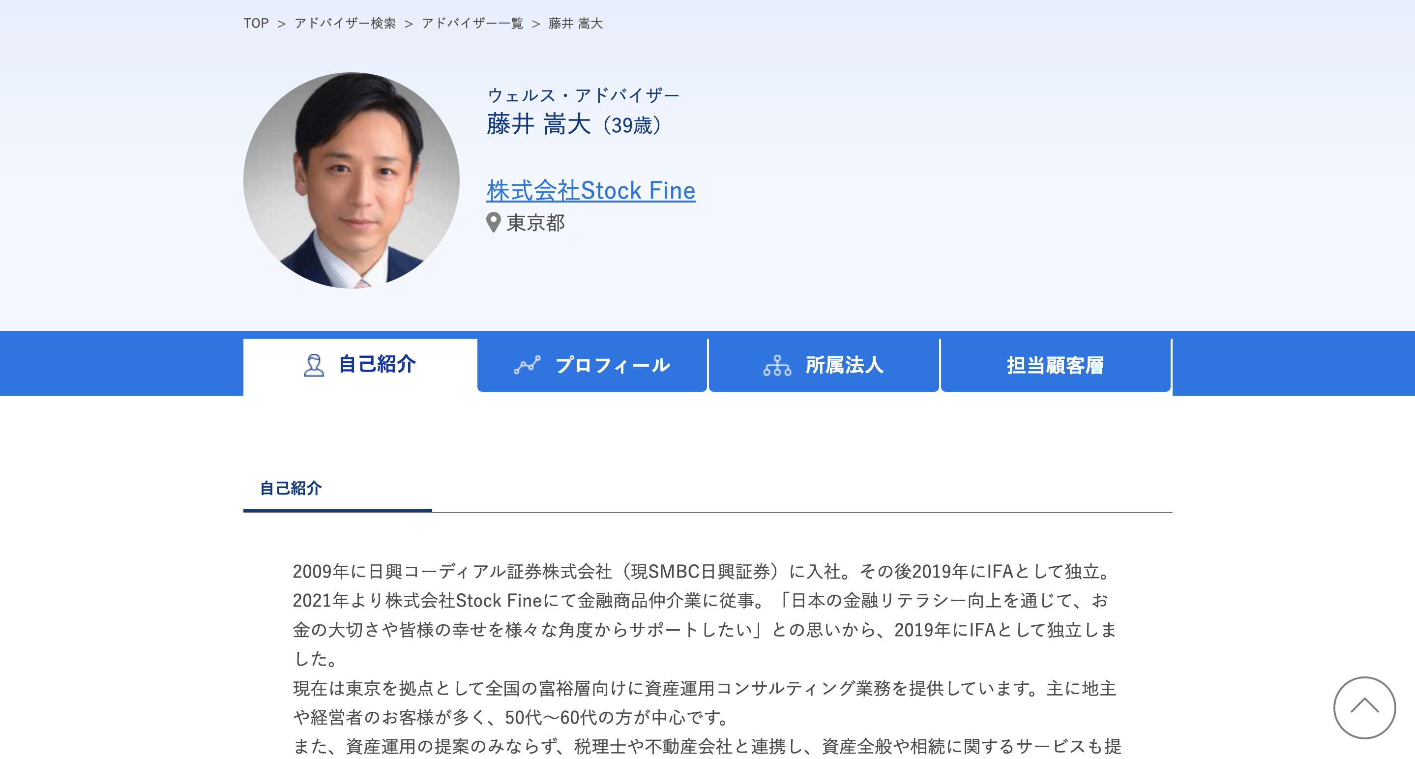 ・アドバイザー(IFA)ごとの得意な領域や保有資格、連携証券会社、経歴などを閲覧できるようになっております。