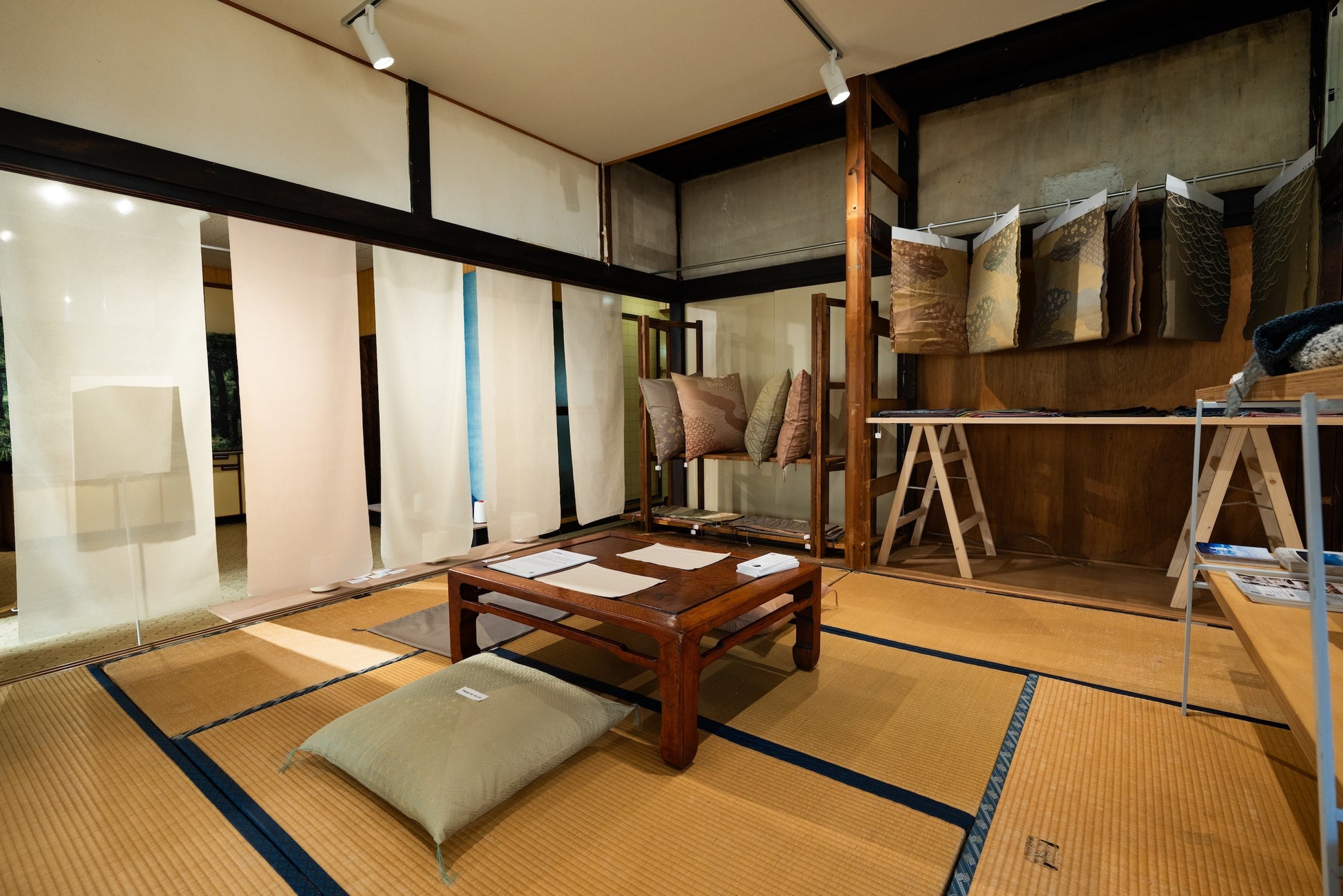 会場では、演色性の高いLEDを搭載した照明器具を使用しています。従来の光源や一般的なLED照明に比べ、白や黒を含むすべての色の再現性が高く、色彩を鮮やかに表現します。これにより、作り手が込めた織物の繊細な色彩や質感、素材の豊かな表情を忠実に感じていただけます。