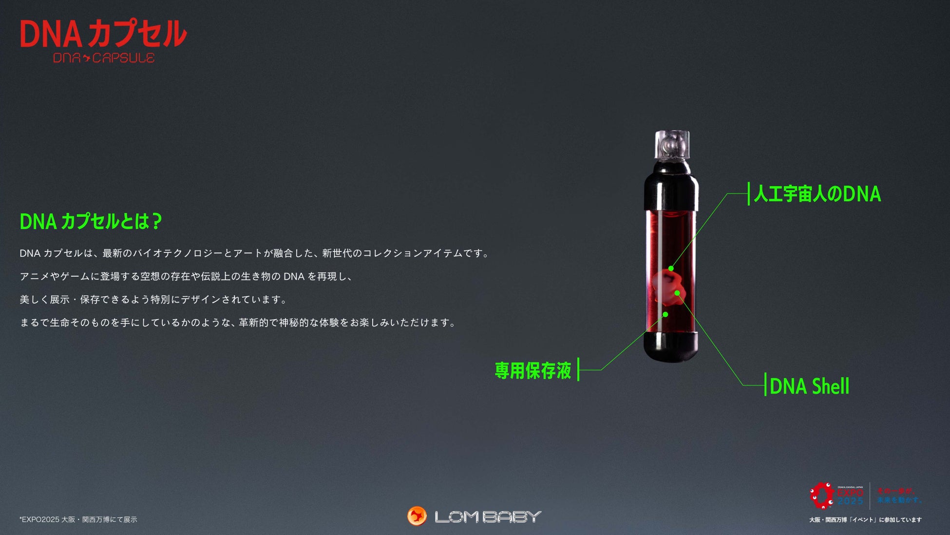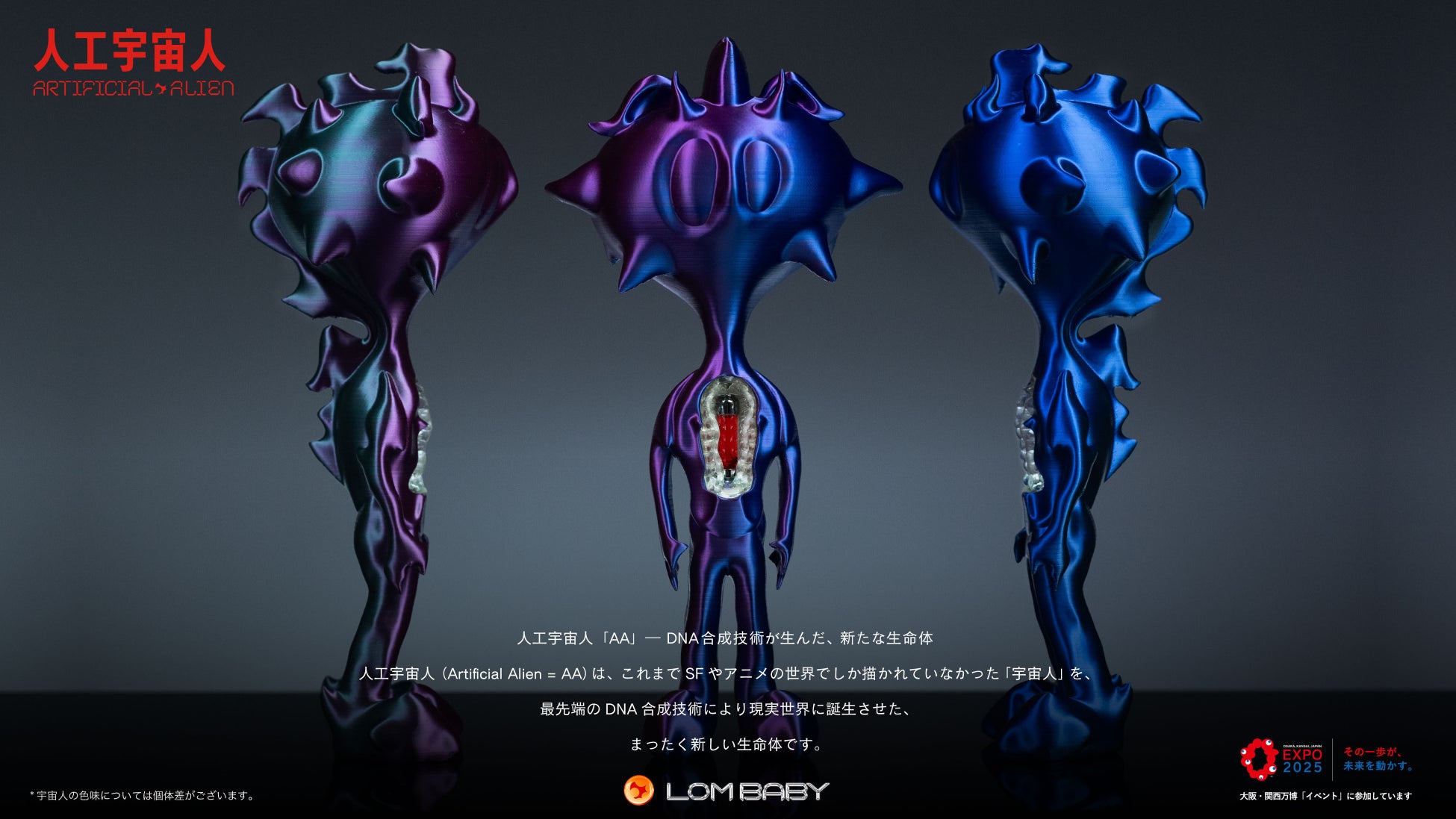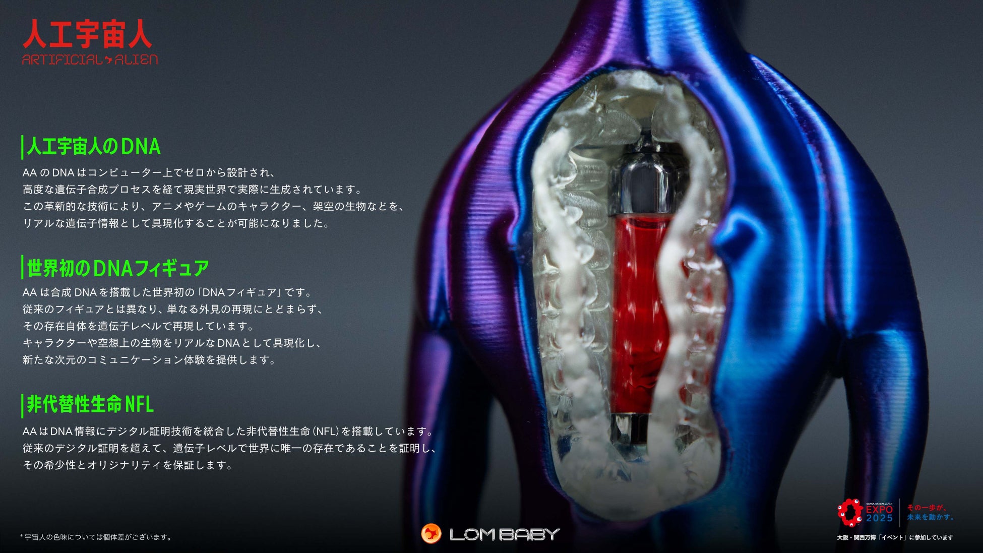 Transeeds Inc.(東京都渋谷区)が主宰するクリエイティブコレクティブ「LOM BABY(ロム ベイビー)」は、2025年大阪・関西万博の特別イベント「Japan Expo Paris in Osaka 2025」にて、DNA合成技術とブロックチェーン技術を融合させた世界初のDNAフィギュア「人工宇宙人AA(Artificial Alien)」および「DNAカプセル」を初公開しました。