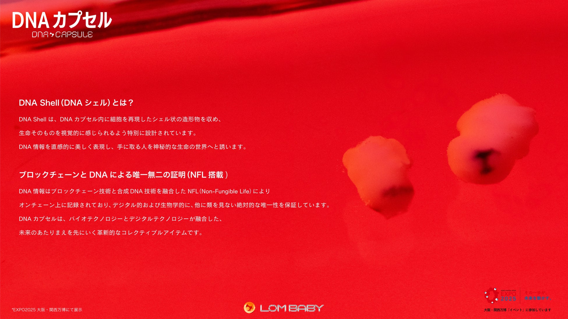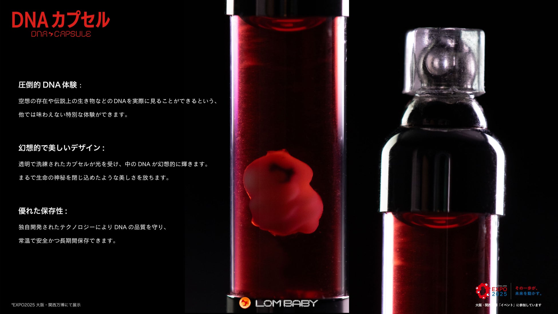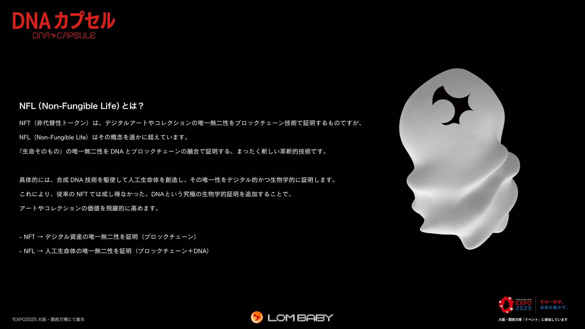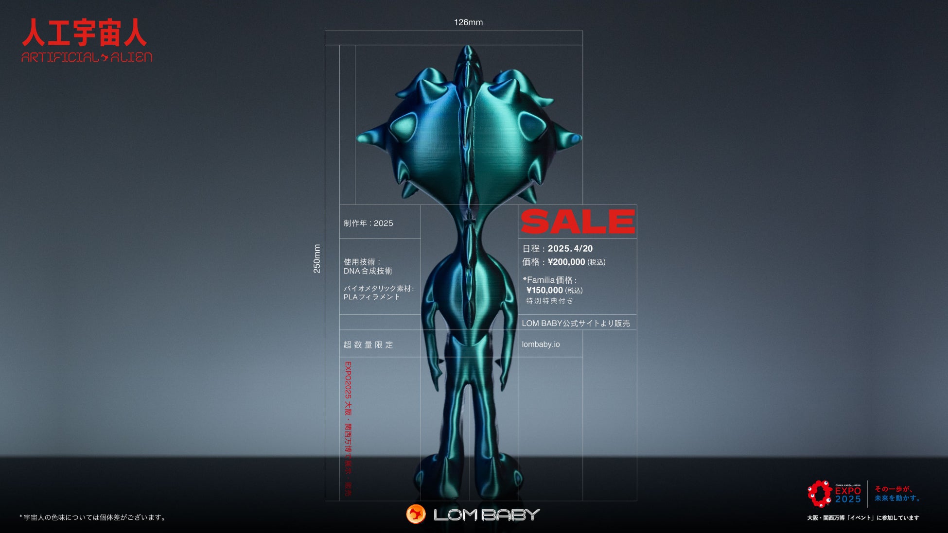 Transeeds Inc.(東京都渋谷区)が主宰するクリエイティブコレクティブ「LOM BABY(ロム ベイビー)」は、2025年大阪・関西万博の特別イベント「Japan Expo Paris in Osaka 2025」にて、DNA合成技術とブロックチェーン技術を融合させた世界初のDNAフィギュア「人工宇宙人AA(Artificial Alien)」および「DNAカプセル」を初公開しました。
