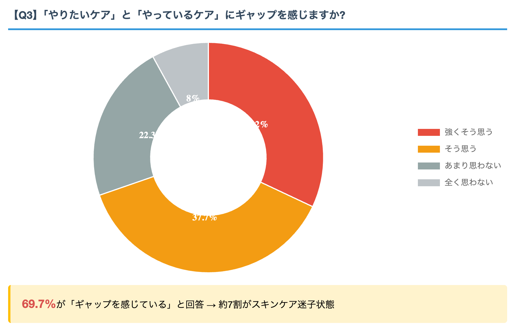 その結果、69.7%の方が「ギャップを感じている」と回答し、約7割の女性が「スキンケア迷子」状態にあることが明らかになりました。