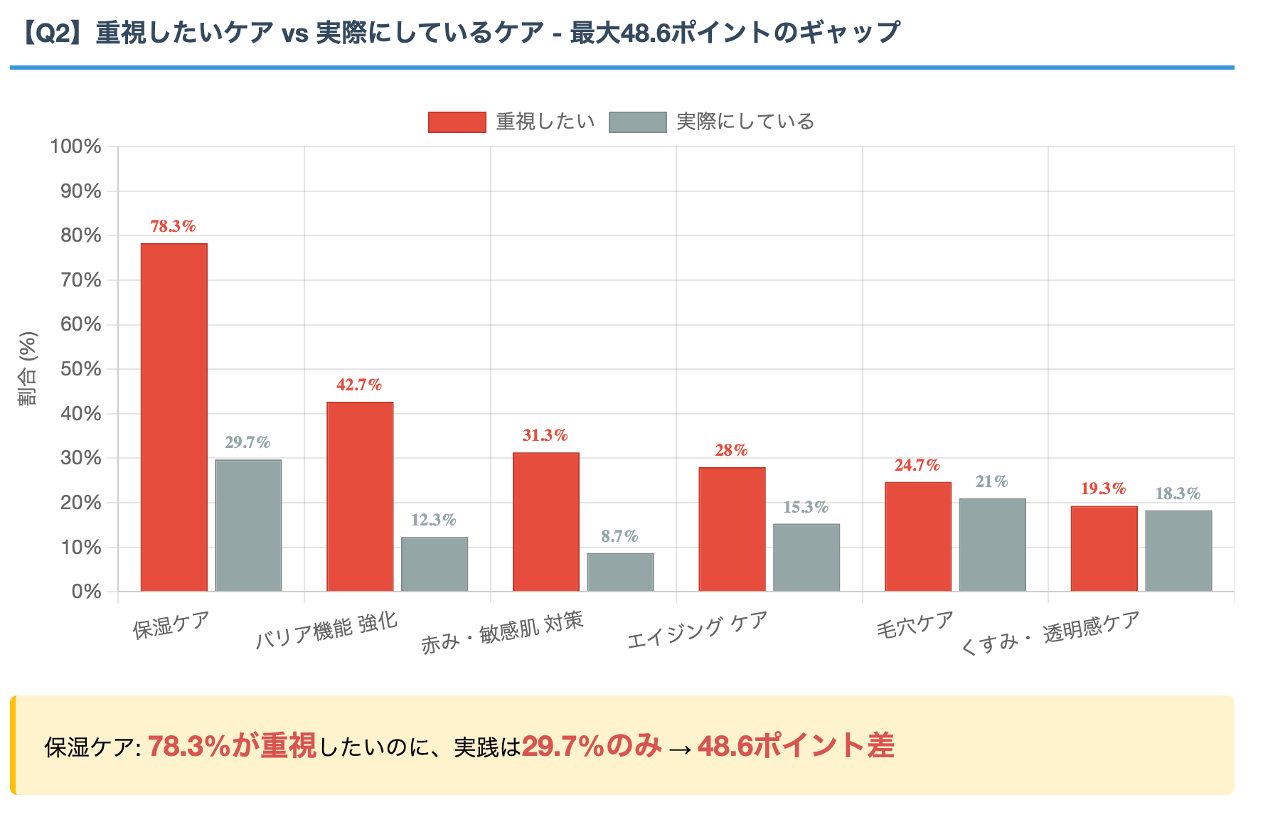 特に「保湿ケア」「バリア機能強化」「赤み・敏感肌対策」など、季節の変わり目に必要とされるケアで、意識と行動の乖離が大きいことが分かりました。