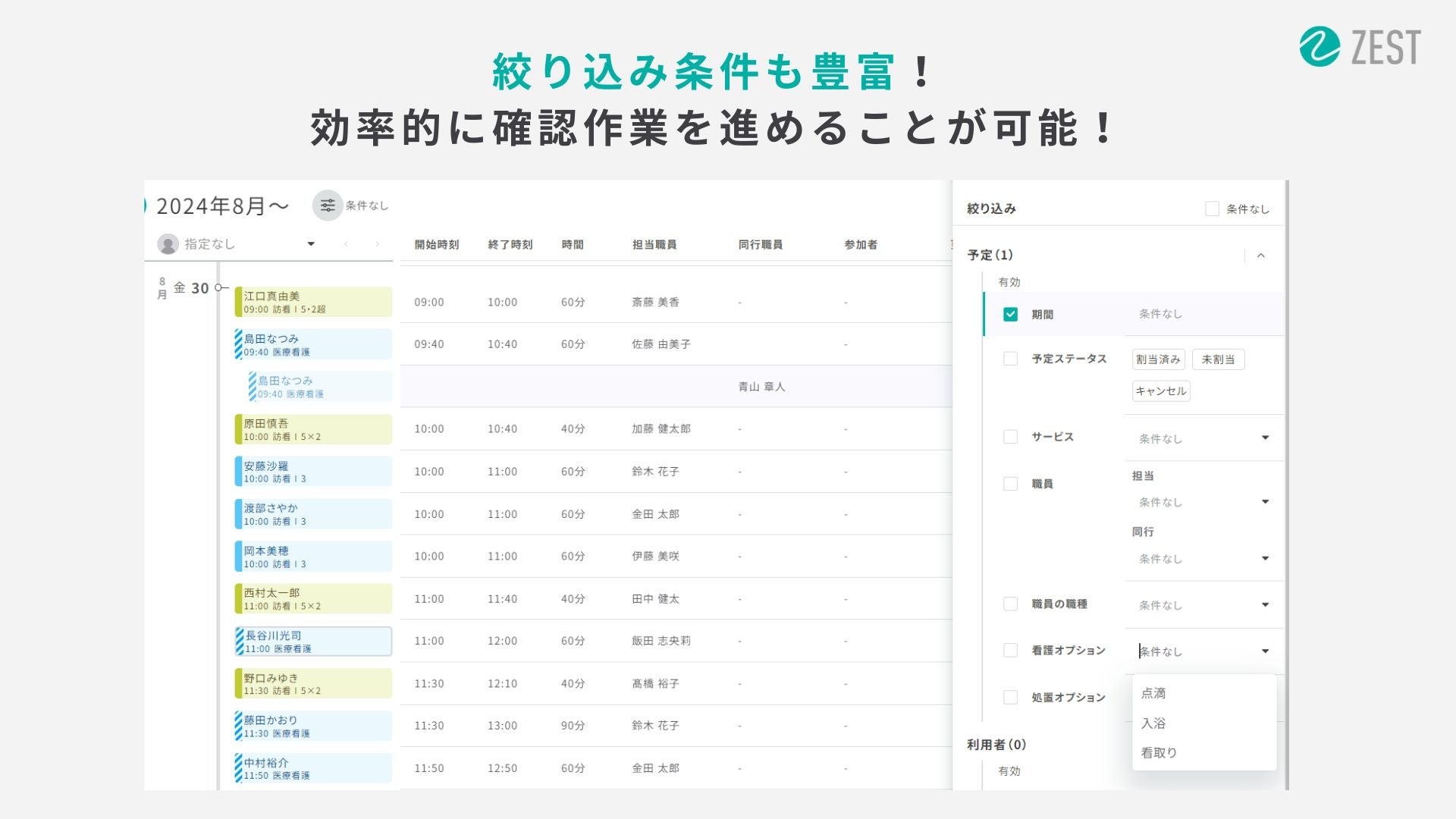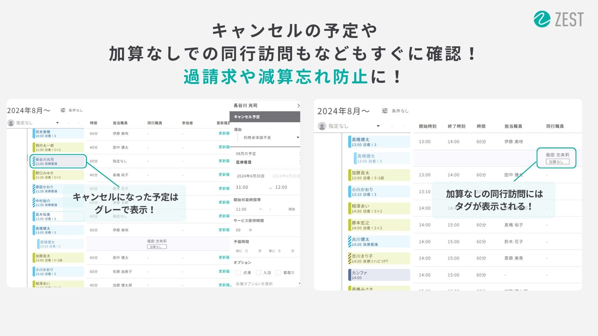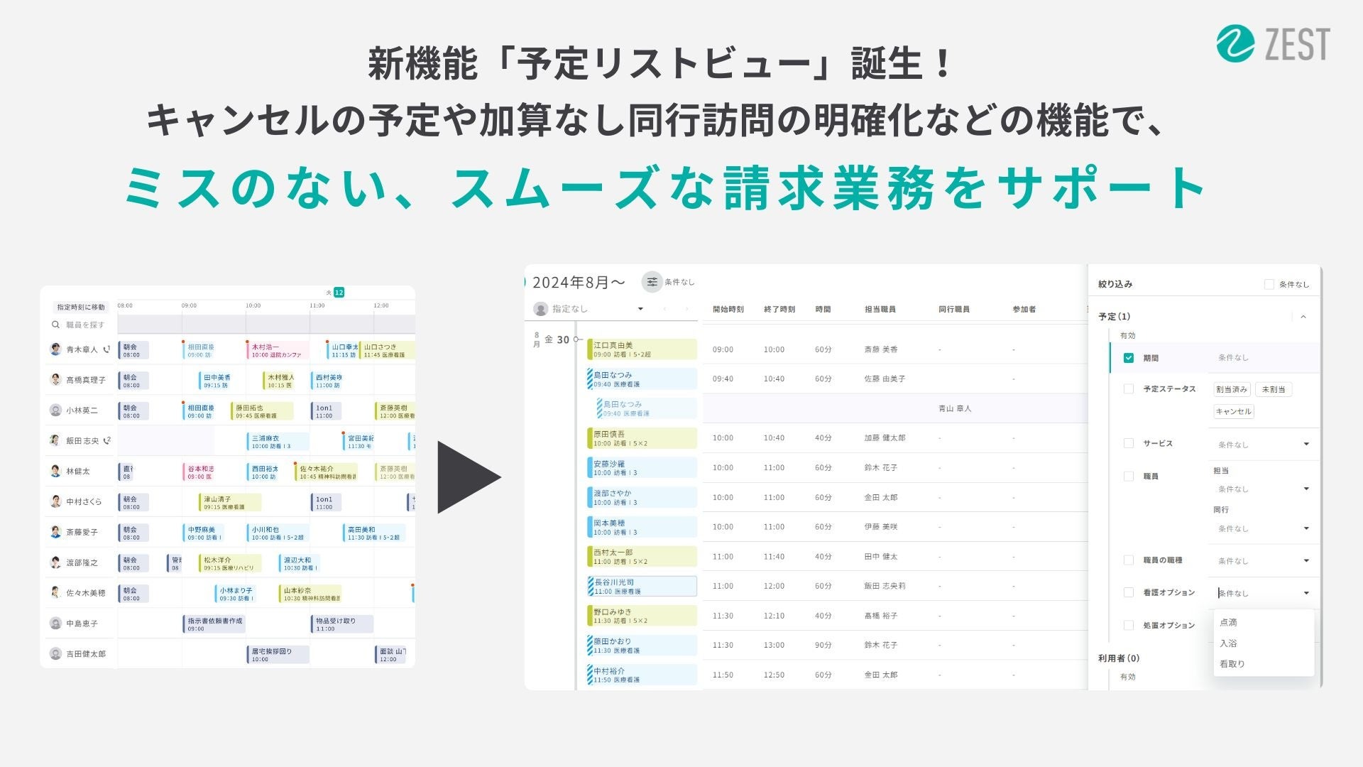 AI搭載 訪問スケジュール自動作成クラウド『ZEST』|新機能「予定リストビュー」誕生!キャンセルの予定や加算なし同行訪問の明確化など、ミスのない、スムーズな請求業務をサポート