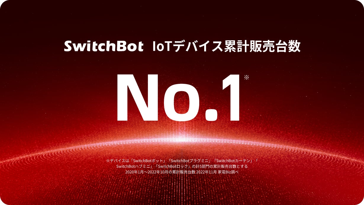 SwitchBotは、IoTスマートホームデバイスの企画、製造、販売を行うスマートホームブランドです。従来の家具や家電を後付けでスマート化できる便利性や自由に組み合わせられる拡張性の高さが評価され、日本国内のユーザーは100万世帯、販売累計台数は300万台を突破しました。また、おかげさまで2022年家電Bizにより「IoTブランドNo.1」に認定。今後も手軽にスマートホームが実現できるクリエイティブな製品を提供できるよう、先端技術の開発・改善に努めてまいります。