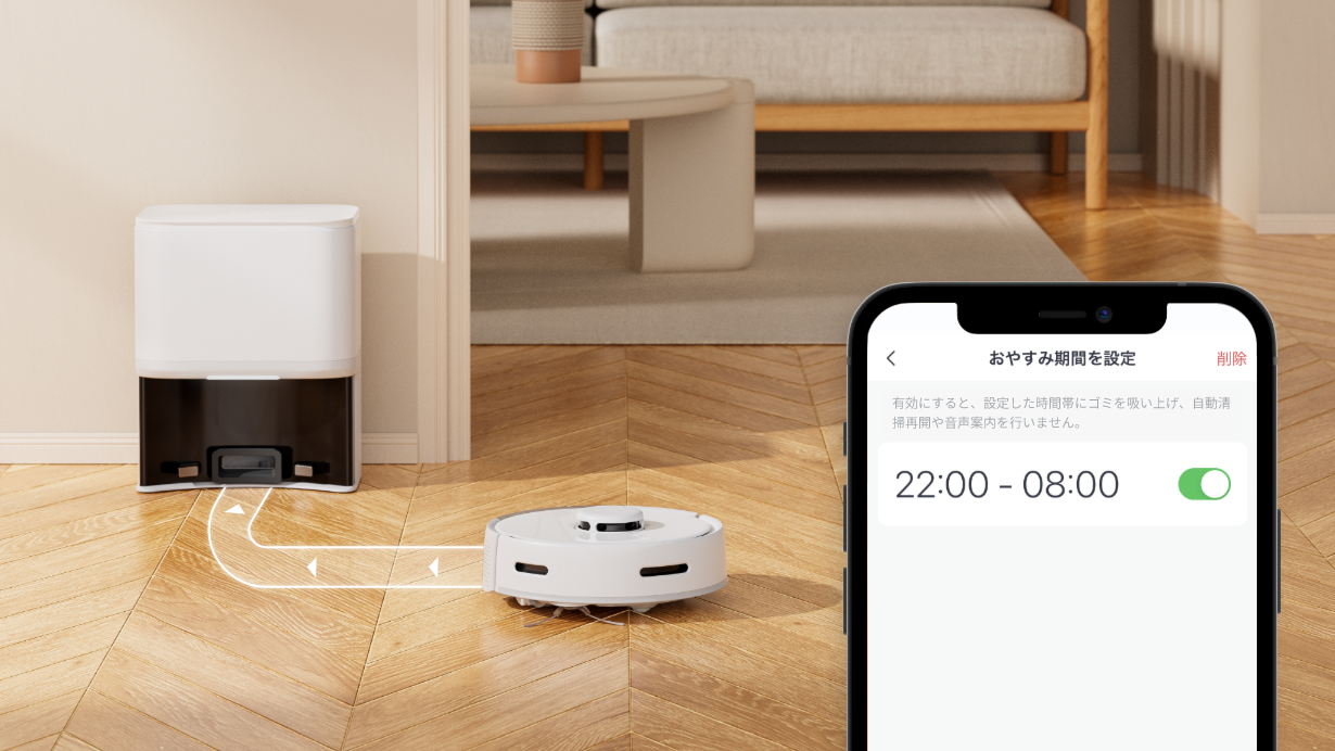 なんと図書館よりも静かな運転音を実現。騒音レベル50dB※未満で、運転音を気にせず、いつでもどこでもお好きなタイミングでお掃除していただけます。また、ゴミ収集ステーションへの排出時間禁止時間帯が指定可能に。排出時の音が気になり、早朝や夜間の使用をためらうとお悩みの方は、夜間は作動禁止に設定するなど、ゴミ収集音を気にせずご利用いただけます。(※自社ノイズ対策実験ラボによる結果)