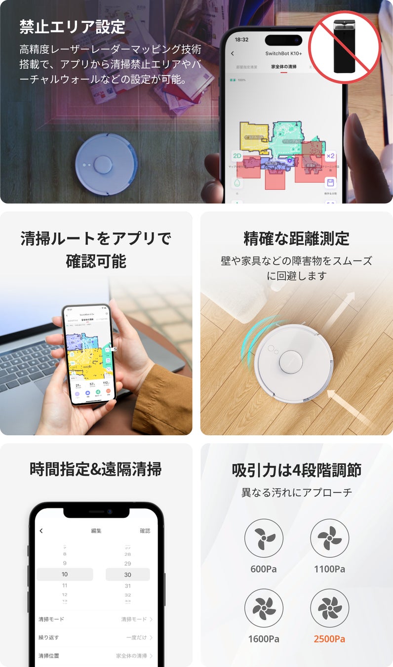 弊社では、過去3年間に亘って約2500以上の家庭に、ロボット掃除機に関する市場調査を実施。「家具に引っ掛かる」「部屋の隅や壁際の掃除が甘い」「ほとんどのロボット掃除機が馬力重視で、サイズも運転音も大きい」など、ユーザーの悩みにフォーカスして考えた結果、こうした悩みの原因は、市販されているほとんどのロボット掃除機が欧米市場向けに設計されていることだと分かりました。「SwitchBotロボット掃除機K10+」は、現在販売されているロボット掃除機の多くが、日本での暮らしや日本人の求める清掃スタイルには向いていないという点に着目し、「日本人にとっての“使いやすさ”」を追求した製品となっております。