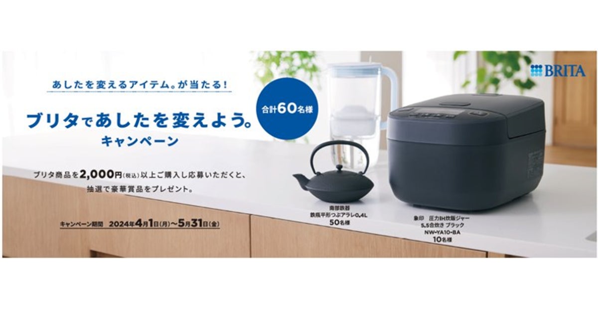 このたび、本プロジェクトの一環として、ブリタ商品を税込2,000円以上お買い上げいただきご応募いただくと、暮らしがちょっと素敵に変わる“あしたを変える” アイテムが合計60名様に当たる『ブリタであしたを変えよう。キャンペーン』第1弾を、2024年4月1日(月)~5月31日(金)として実施いたします。