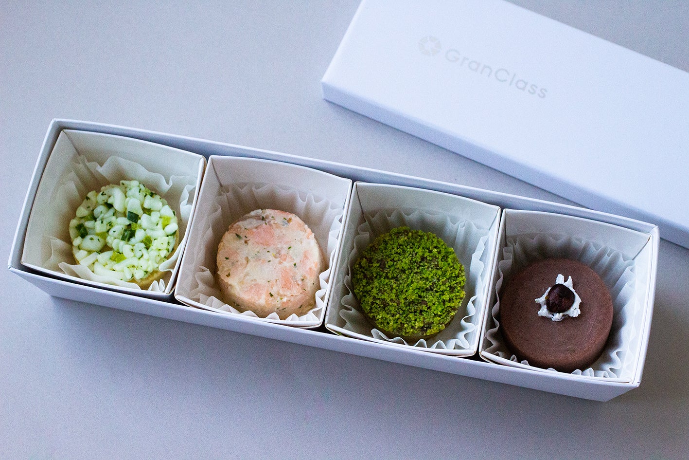 グランクラスで旅先に向かう時にこれからの旅がワクワクできるよう。彩りも鮮やかでワインだけでなく日本酒など様々なドリンクとも相性の良いこのアペタイザーのような軽食は旅の最高の前菜になることでしょう。 また、家路に着く帰りのグランクラスでも旅の楽しかった思い出の食後のミニャルディーズのような存在です。 またグランクラスでどこかに行きたいなぁと思ってもらえる、そんな存在の楽しめる料理をこれからも提供していきます。