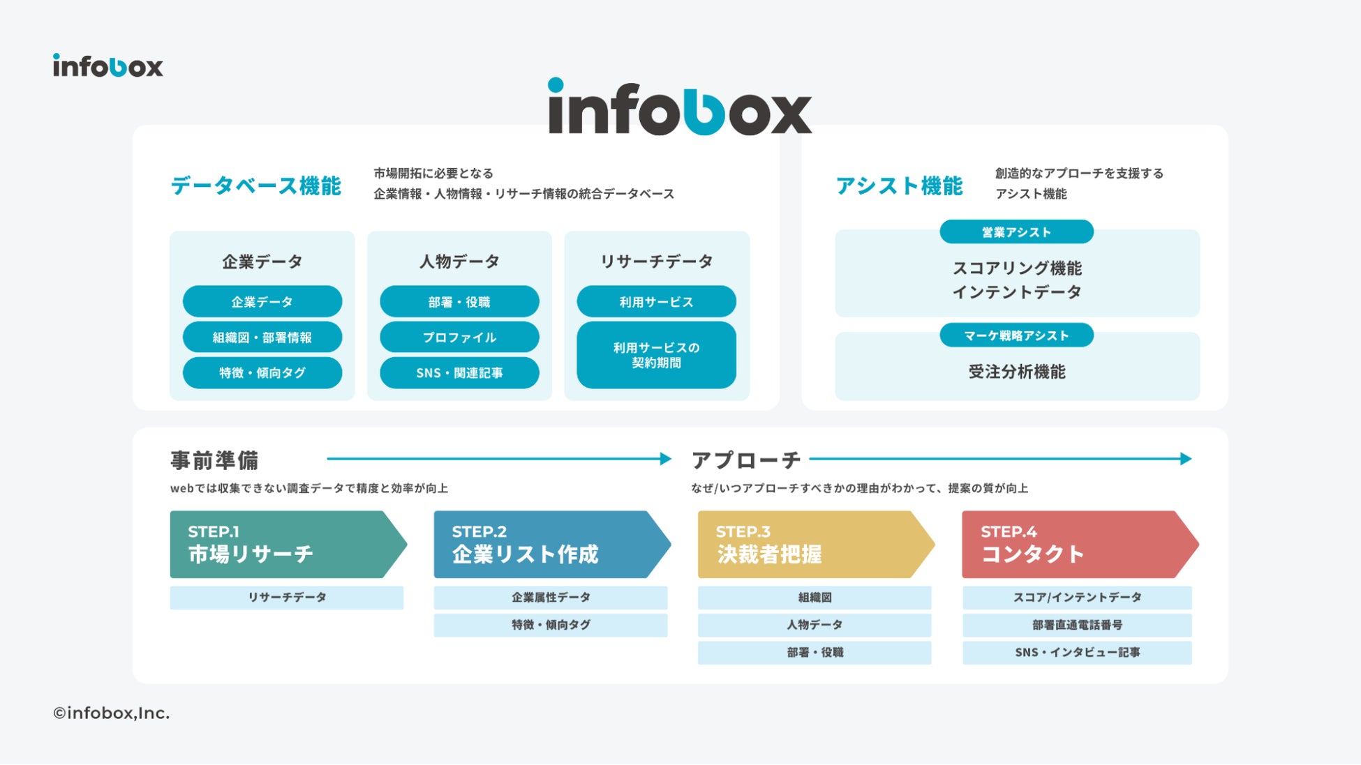 インフォボックスは、2024年2月に、企業リストの作成から決裁者へのアプローチまでを一気通貫で担う営業データプラットフォーム「infobox」をリリースしました。