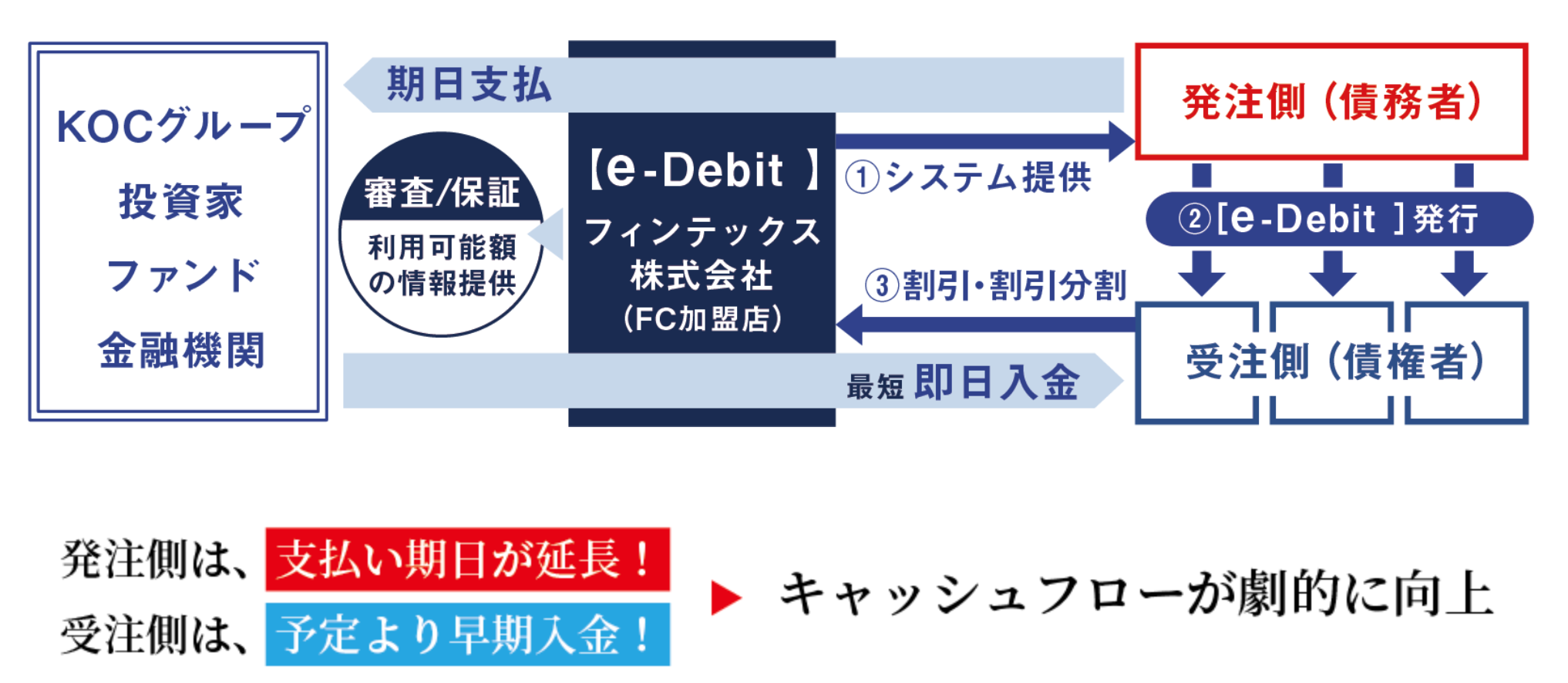 「e-Debit」は、ネットで簡単に発行でき、資金繰りの改善とキャッシュフローを安定させる、新しい企業の支払サービスです。お客様の買掛金を「e-Debit」で発行することで、代金の支払いを最大180日延長してお支払いすることができ、受取先も「e-Debit」の起算日から割引きすることが可能になります。これにより、両社共に資金繰り対策が可能になり、万が一の備え、事業拡大への投資が可能になります。