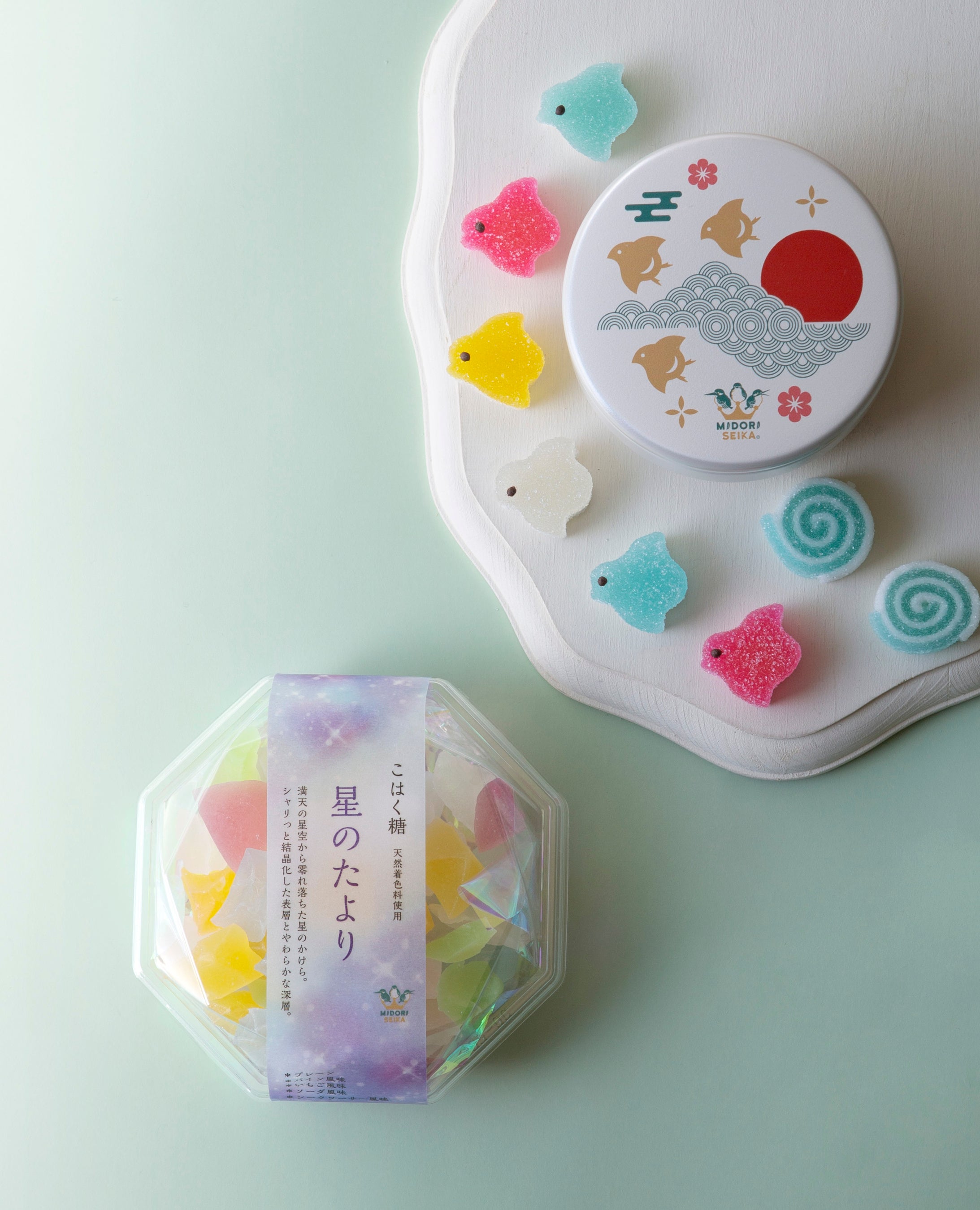 上品な味わいとキラキラと美しい色合で話題の琥珀糖「星のたより」。職人がひとつひとつ丁寧に宝石の形に削り出しており、外はシャリっと中は柔らかく上品な味わい。美味しいだけでなく、味覚も視覚も楽しめる商品です。