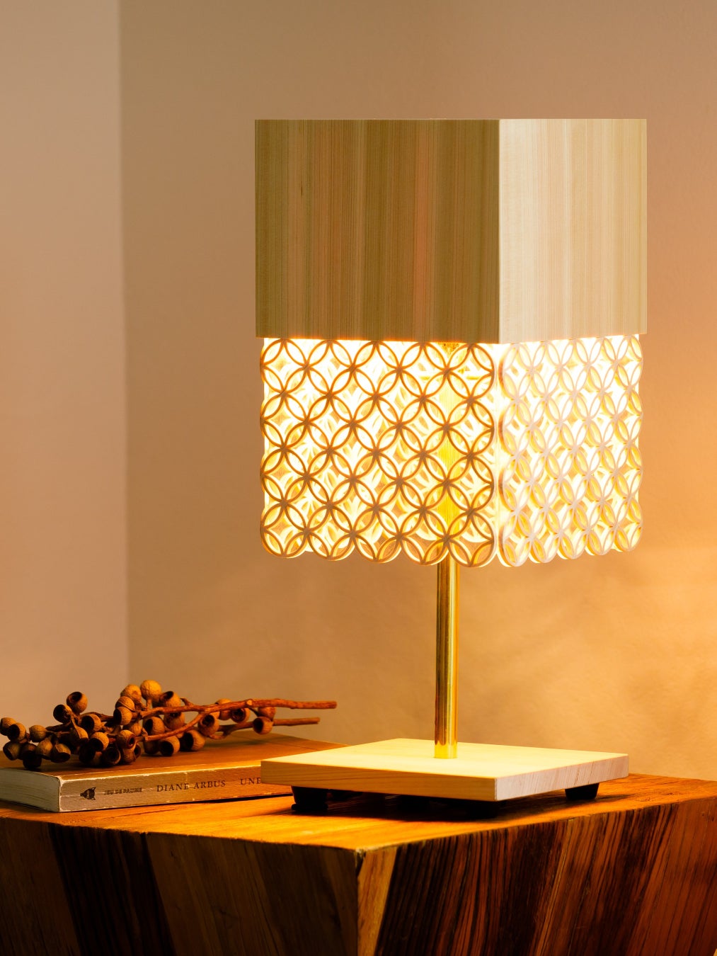 縁起の良い七宝組子を用いた花組子シリーズの新商品「花組子テーブルスタンド」。レースのような花組子が光と影で表情豊かな空間を演出します。