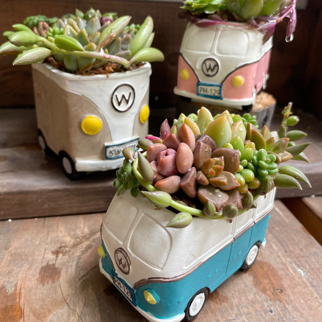小さな器に盛り盛りに寄せ植えした愛らしいフォルムが人気です。