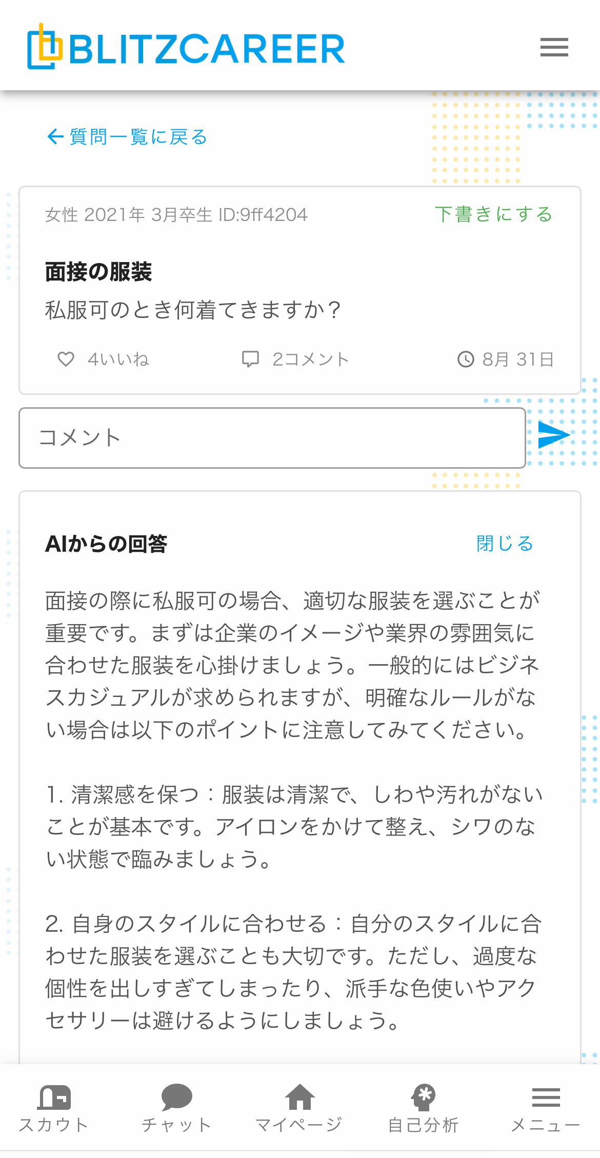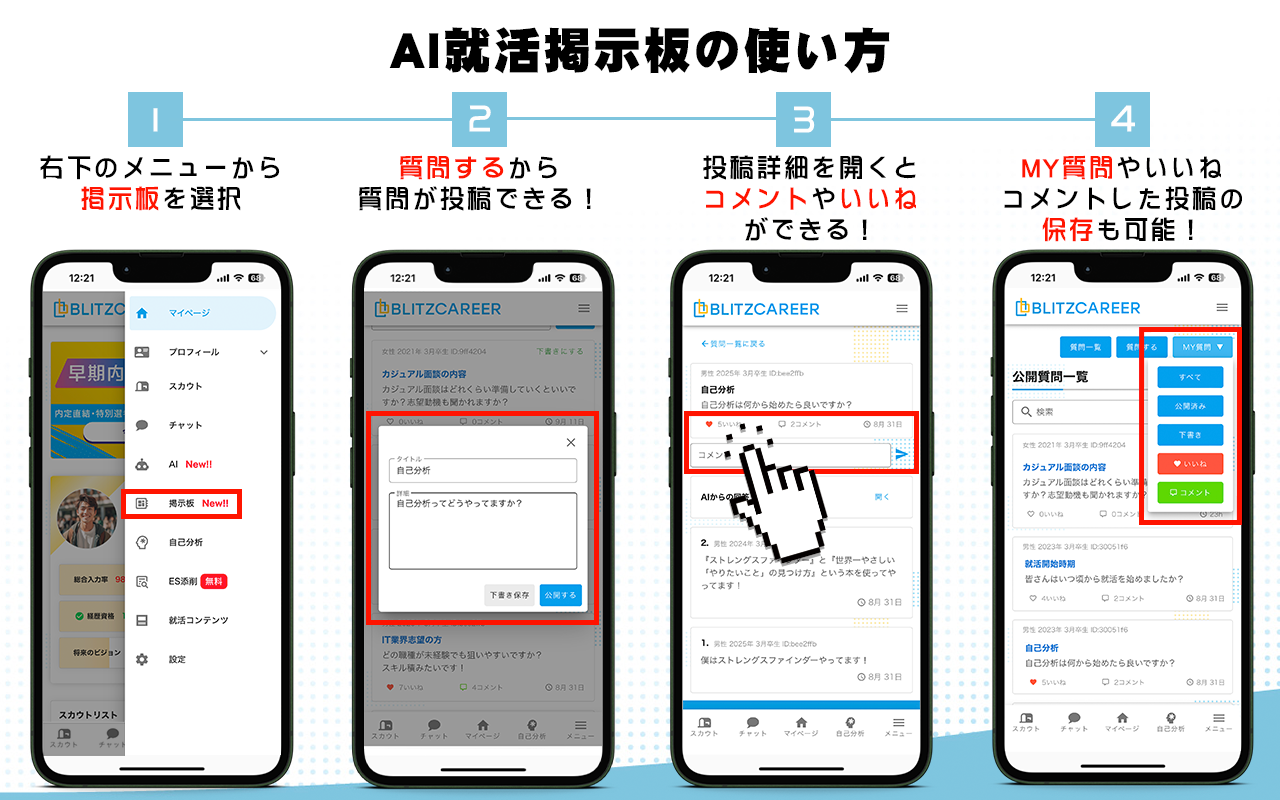 AI就活掲示板は、就活生が日常の悩みや質問を投稿し、匿名でコメントやいいねをつけることができる新しいコミュニケーションプラットフォームです。BLITZCAREERには就活を経験した先輩も多く登録しており、先輩や就活生同士で気軽に情報交換できるのが大きな魅力です。