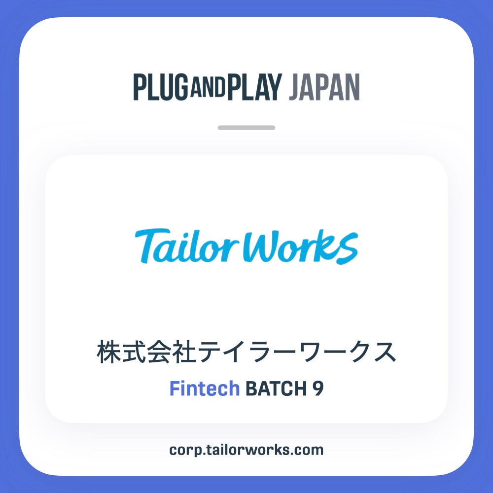 株式会社テイラーワークス(所在地:東京都渋谷区:代表取締役会長 山本 浩之/代表取締役社長 難波 弘匡、以下、テイラーワークス)は、Plug and Play Japan が提供するアクセラレータープログラム、Summer/Fall 2022 Batch の「Fintech(フィンテック)」部門に採択されました。