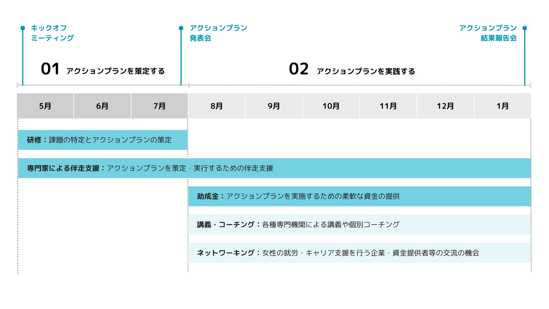 本プログラムでは、女性の就労・キャリア支援に関する最新の知見やトレンドを学びながら、専門家による研修や伴走支援、柔軟な資金提供、ピアラーニングを通じて、参加団体が事業を次なる段階へと発展・深化させるための中長期的な戦略をもとに、課題解決に向けたアクションプランの設計・実施を支援します。