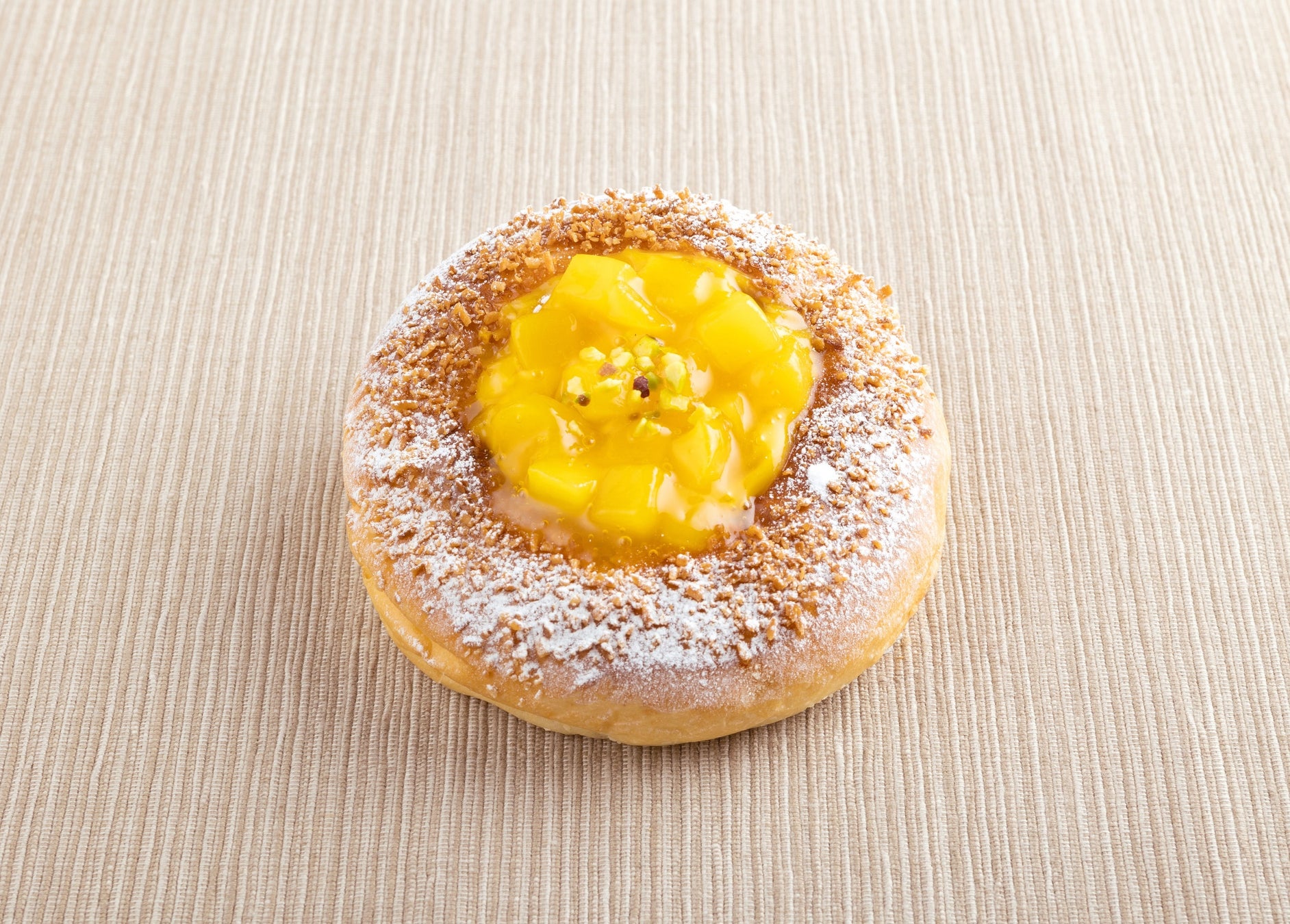 ふわふわのパンに、マンゴークリームを入れ、さらに果実感のあるマンゴーソースをトッピング。濃厚なマンゴーが味わえる、夏にぴったりのクリームパン。