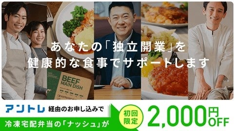 個人の独立・開業の支援事業を展開する株式会社アントレ(本社:東京都港区、代表取締役:上田隆志)は、手軽に美味しく栄養管理ができる冷凍宅配食サービス『nosh(ナッシュ)』を手掛けるナッシュ株式会社(本社:大阪市、代表取締役 社長:田中智也)と、独立・開業を目指す33万人の「アントレ会員」ネットワークをいかし、多忙な生活の独立希望者へ、管理栄養士考案の食事が定期的に届く支援を、この度、開始することをお知らせします。