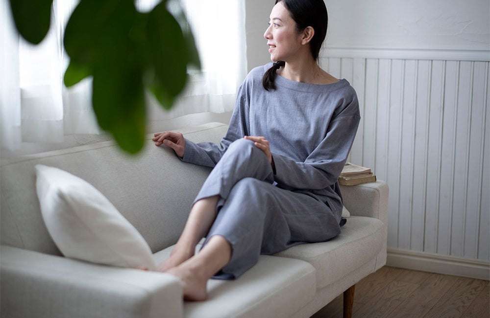 ボタンのないかぶりタイプでよりルームウェアや洋服に近いデザインにすることで、パジャマの着心地の良さは保ちつつ、見た目のパジャマ感を減らし急な来客やもしもの災害時にも安心です。