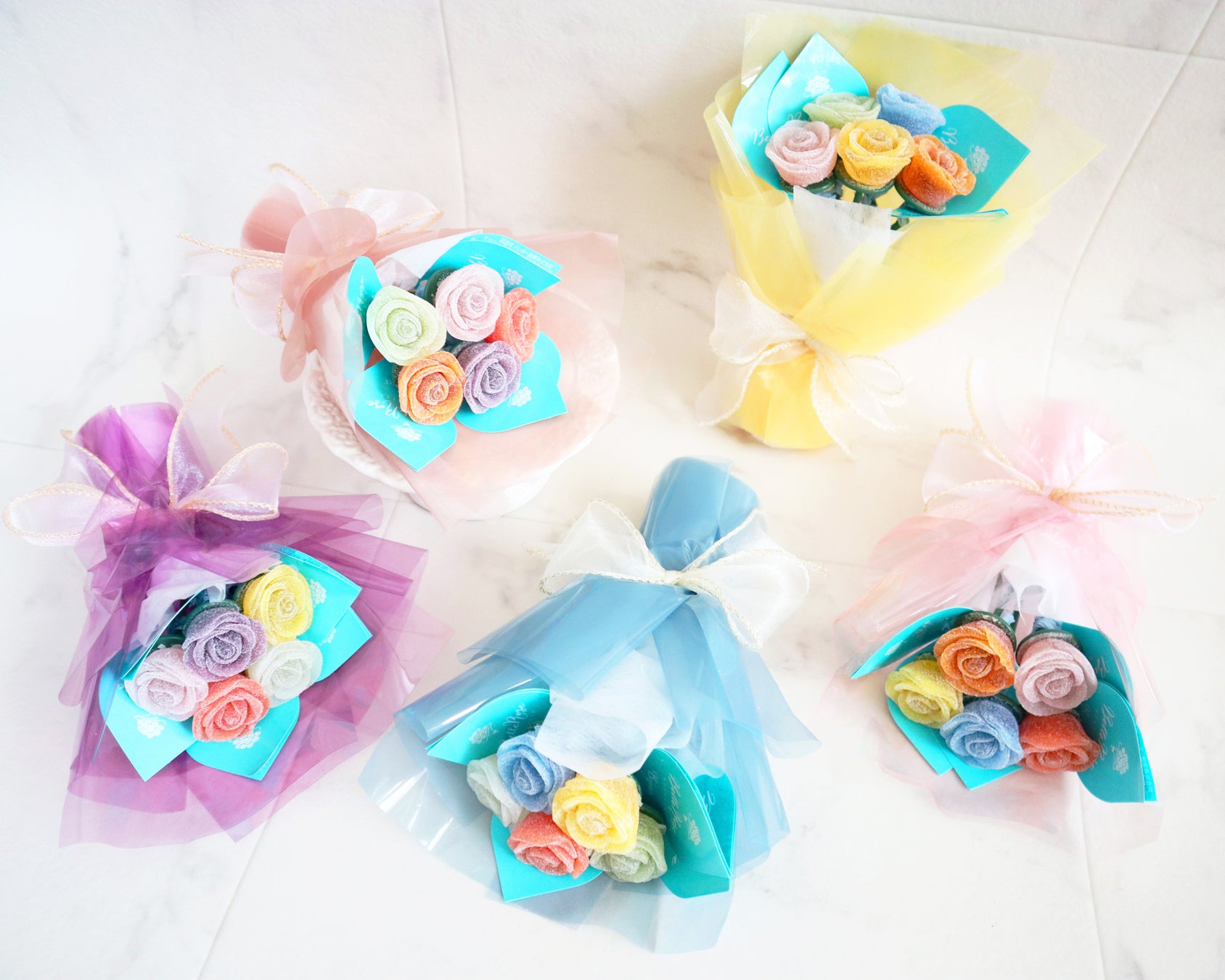 1本ずつのご購入はもちろん、贈る相手のイメージや好みに合わせて、お好きなフレーバーや色を自由に組み合わせたオリジナルのバラグミブーケもお作りいただけます。