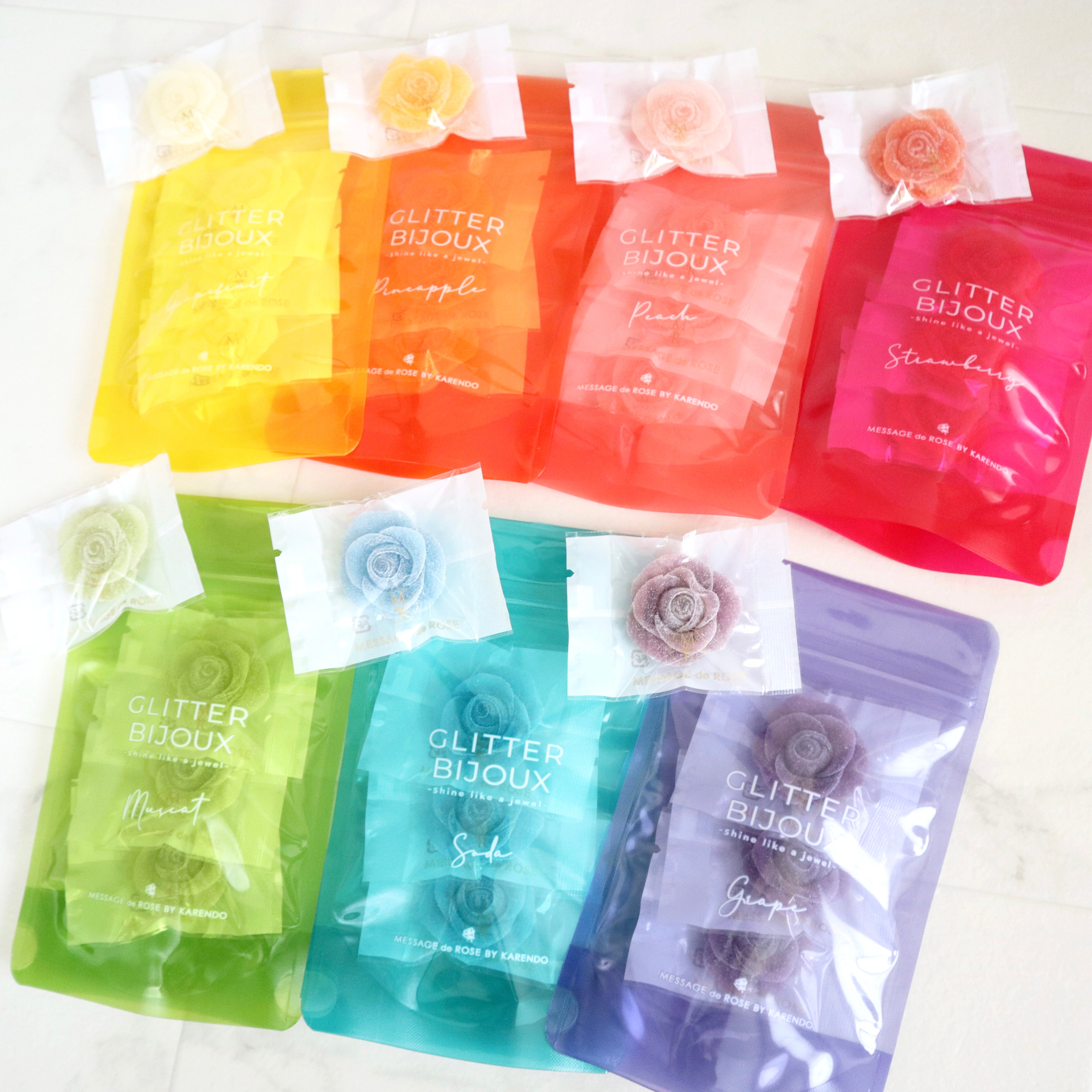 虹のようにカラフルで、透明感あふれる全7色のパウチには、宝石(ビジュ)のように輝くバラの形のグミが入っています。色ごとに異なるフレーバーには、本物のフルーツ果汁を贅沢に使用。ひと口で広がるフレッシュでジューシーな果実の風味が、味覚だけでなく心まで満たします。