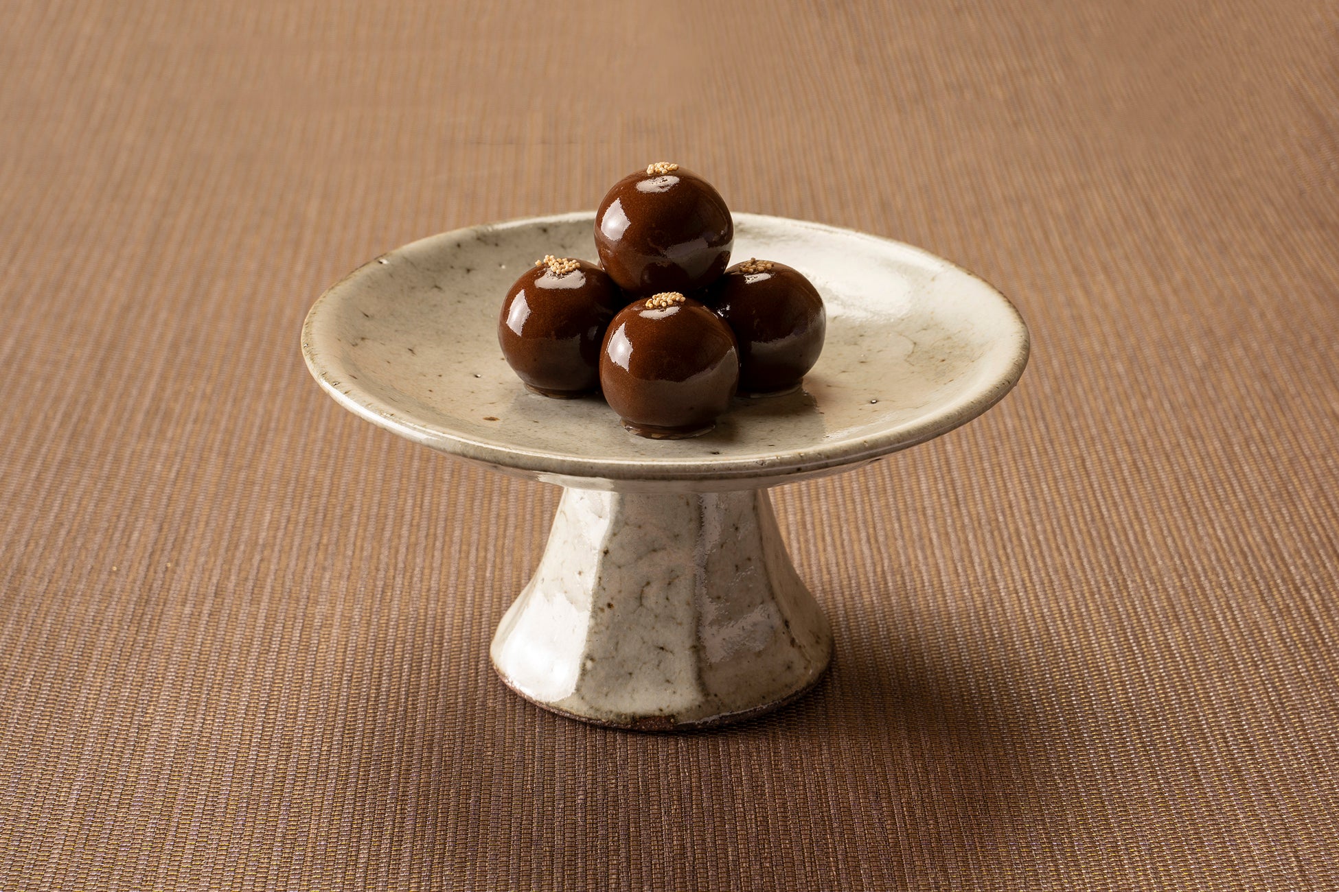 波照間島産の黒糖で炊いたなめらかなこし餡を、寒天とけしの実をたっぷりとかけて仕上げました。檜扇の実を思わせる、漆黒の意匠です。コクと甘みが広がり、黒糖と餡の余韻が残ります。