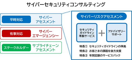 このような中、このたび、『サイバーアセスメント』対応として、「セキュリティガイドライン準拠サービス」と「アドバイザリーサポート」を組み合わせた「サイバーリスクアセスメント」を年間パック(定額)で提供します。