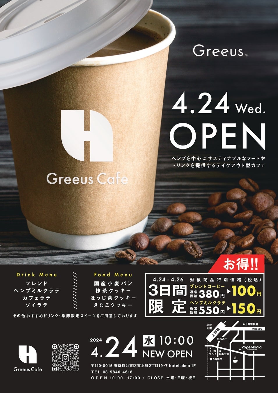 4/24のオープンから4/26まで、ブレンドコーヒーとヘンプミルクラテを特別価格で提供。上野駅から徒歩数分の好立地で気軽にヘルシーな食事が楽しめるテイクアウト型カフェ