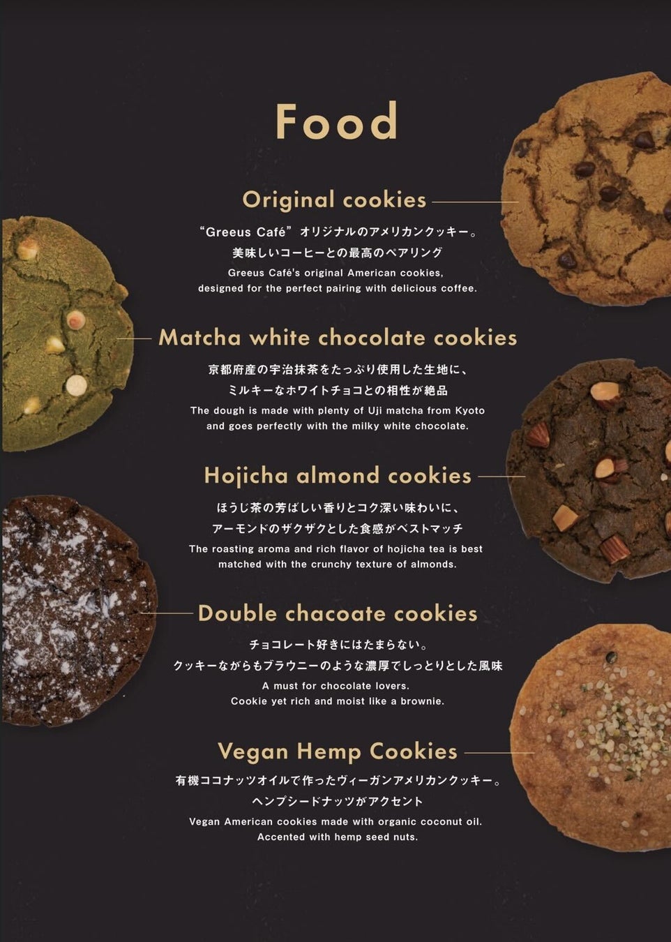 CBDクッキーのパイオニアTOKYO HAZEが監修する様々なフレーバーのクッキーをはじめ、Greeus Cafeでは気軽な軽食や栄養補給に最適なパン等、充実したフードメニューをご用意しています。