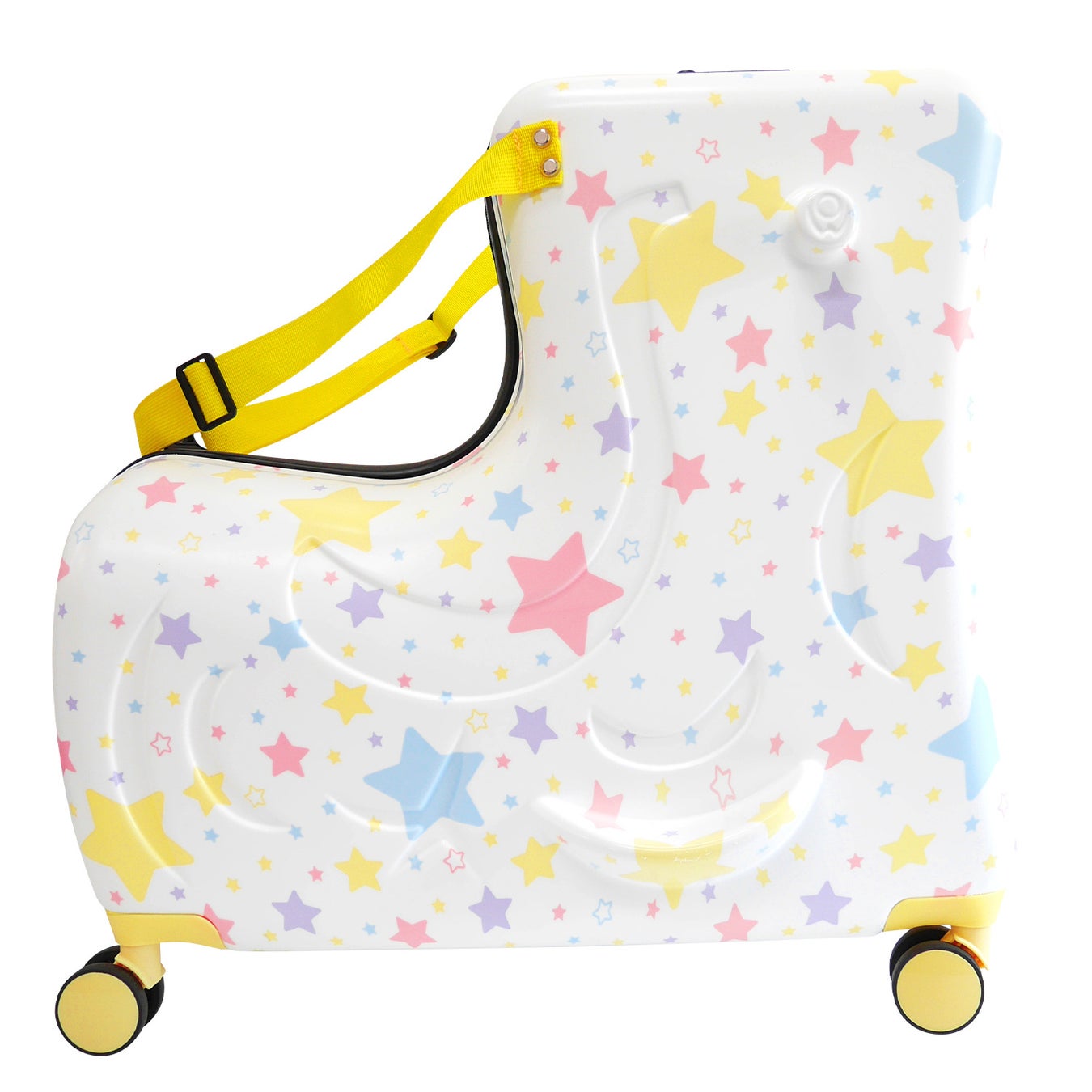 L字型の形状で安全ベルト、足置き、ハンドルがつき、子どもを乗せたままスムーズな移動が可能