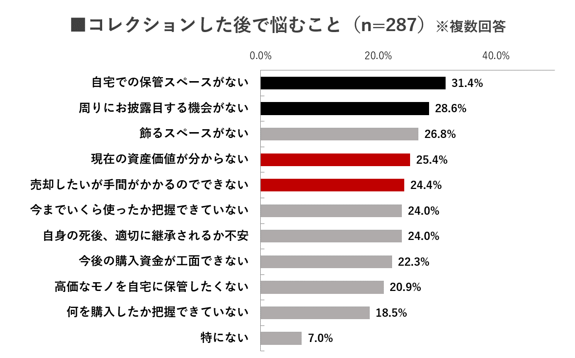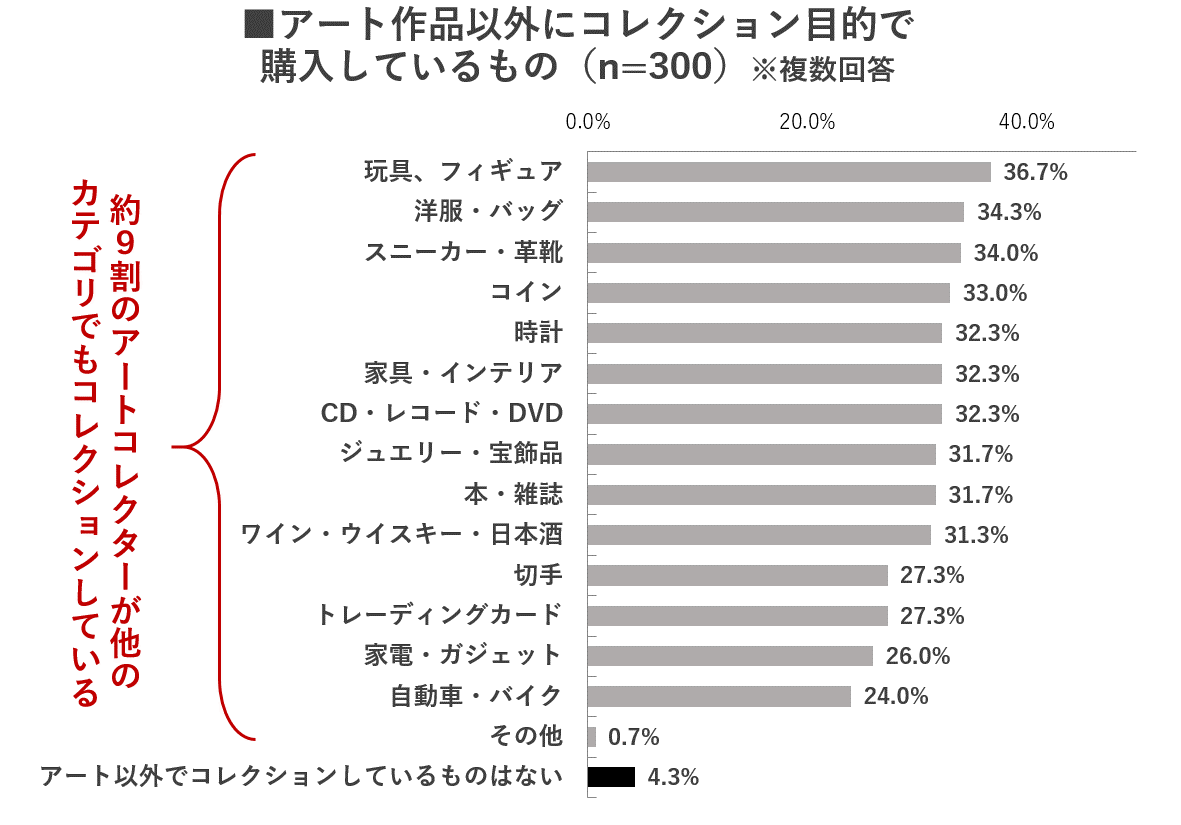 当社がアートコレクター300名を対象にした実態調査では、アート作品以外でコレクション目的に購入するものがある方が9割以上も存在。特に投資額が多いカテゴリとしては、「時計」、「ジュエリー・宝飾品」、「玩具・フィギュア」、「ワイン・ウイスキー・日本酒」などが上位に挙げられ、特定カテゴリに留まらない多岐にわたるコレクションへの高いニーズがあることがわかりました。なお、購入のきっかけは「コレクションの充実のため」が最も多く、4割近い結果になる一方、「資産形成」や「投資」目的の方も3割程度いることも明らかになりました。また、コレクション後の悩みとしては、「保管スペースがない」、「現在の資産価値がわからない」といったこれまで弊社が取り扱ってきたアート作品と同様のニーズが浮き彫りになっています。
