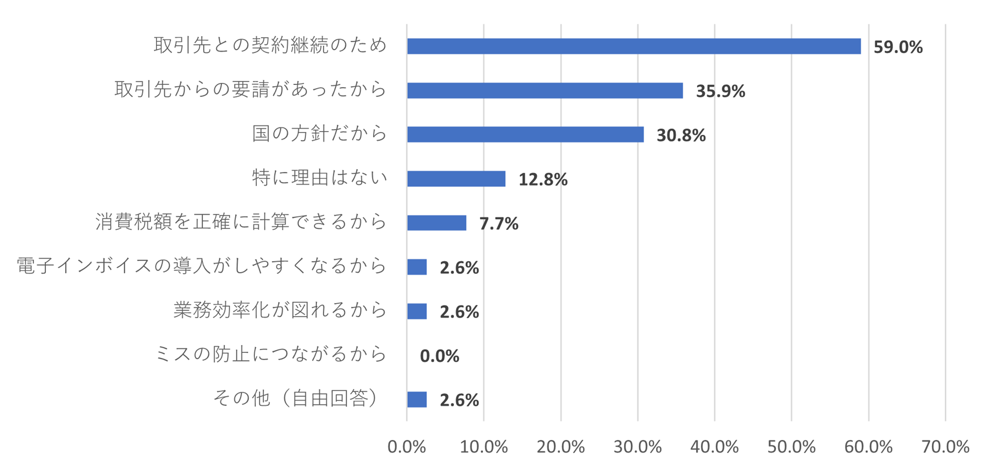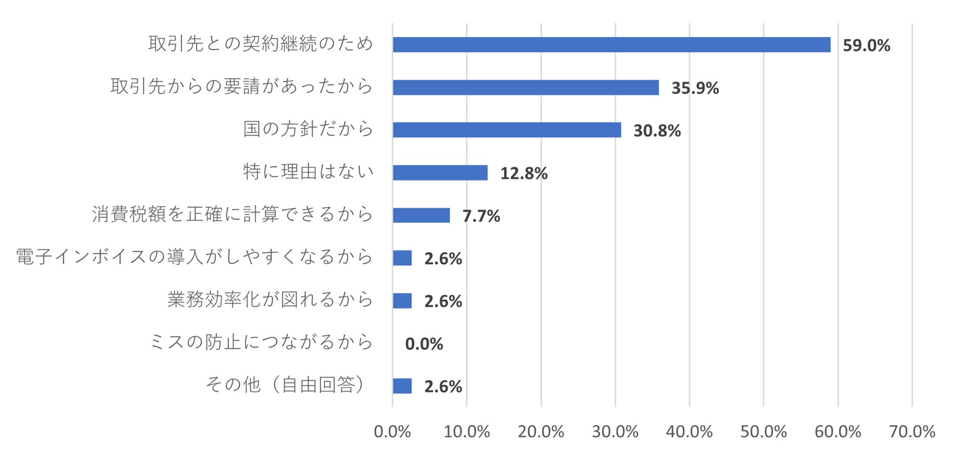 免税事業者の適格請求書発行事業者としての申請理由は、「取引先との契約継続のため」「取引先からの要請があったから」など、取引継続関連が主なものであった。全体としては、最多の「取引先との契約継続のため」が47.8%、次いで「国の方針だから」が46.3%、「取引先からの要請があったから」が26.1%という結果となった。