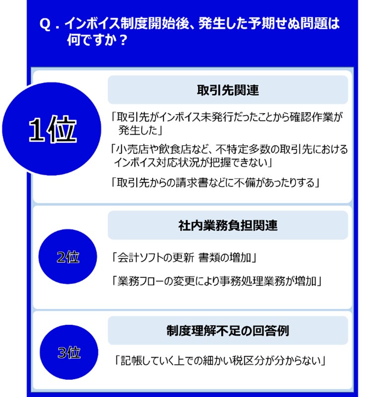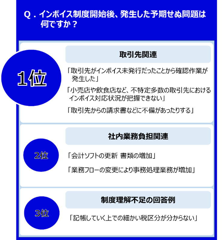 「小売店や飲食店など、不特定多数の取引先におけるインボイス対応状況が把握できない」などがあった。次に多かったのが「社内業務負担」の問題で、「業務フローの変更により事務処理業務が増加」といった回答が見られた。その次が「制度理解不足」の問題で、回答としては「記帳していく上での細かい税区分が分からない」などがあった。