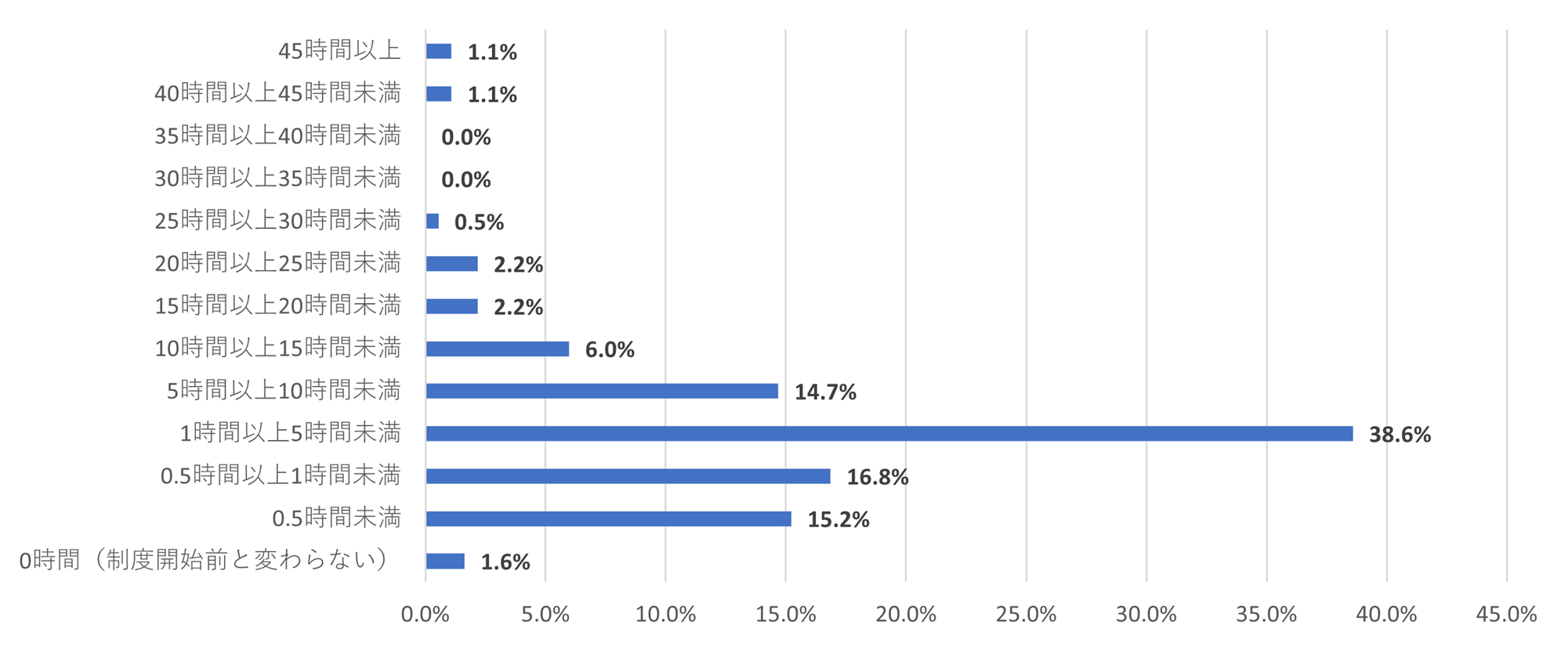 制度開始に伴い、制度への対応によって業務負担が「増えた」と回答した人に開始前と比較してどのくらい業務負担が増えたか聞いたところ、「1時間以上5時間未満」が最多の38.6%という結果となり、経理業務担当者のうち66.3%が月に「1時間以上」発生したと答えた。また最大値として「45時間以上」という回答もあった。