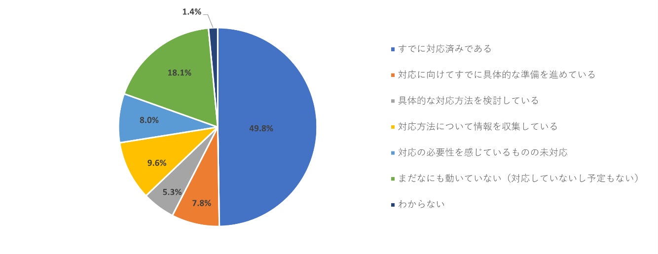 インボイス制度対応状況について聞いたところ、課税事業者のうち9.1%が未対応の状態であると答えた。全体においては、最多が「すでに対応済みである」で49.8%だった。その他、「まだなにも動いていない(対応していないし予定もない)」が18.1%、「対応方法について情報を収集している」が9.6%、「対応の必要性を感じているものの未対応」が8.0%、「対応に向けてすでに具体的な準備を進めている」が7.8%、「具体的な対応方法を検討している」が5.3%、「わからない」が1.4%という結果になった。