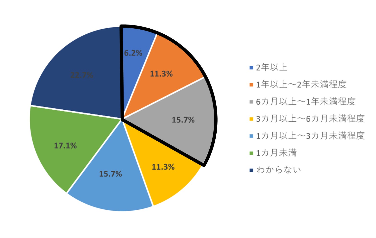 制度対応に向けた準備開始から完了までどのくらいの期間がかかると想定しているか(あるいはかかったか)聞いたところ、「6か月以上」かかった/かかると想定しているという回答が33.2%であった。また、「2年以上」という回答は全体の6.2%を占める結果となった。