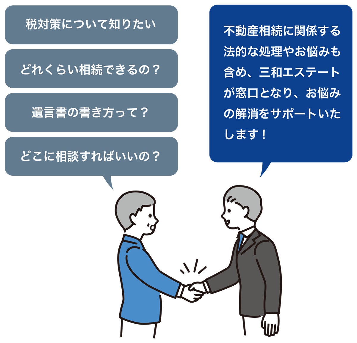 不動産の資産管理会社である「三和エステート」では、相続対策を含めたご相談の最初の窓口となり、独自のネットワークで各士業や専門家と連携しながら解決する「資産サポーター」制度を展開しています。継承される不動産資産の活かし方や選択肢のご提案をはじめ、各士業への窓口を一本化することで相続情報そのものに相関性を作り、より適切な答えを導き出すことを目指します。また、最後まで三和エステートが責任をもってサポートさせていただくことも安心のひとつです。